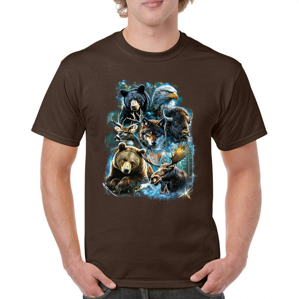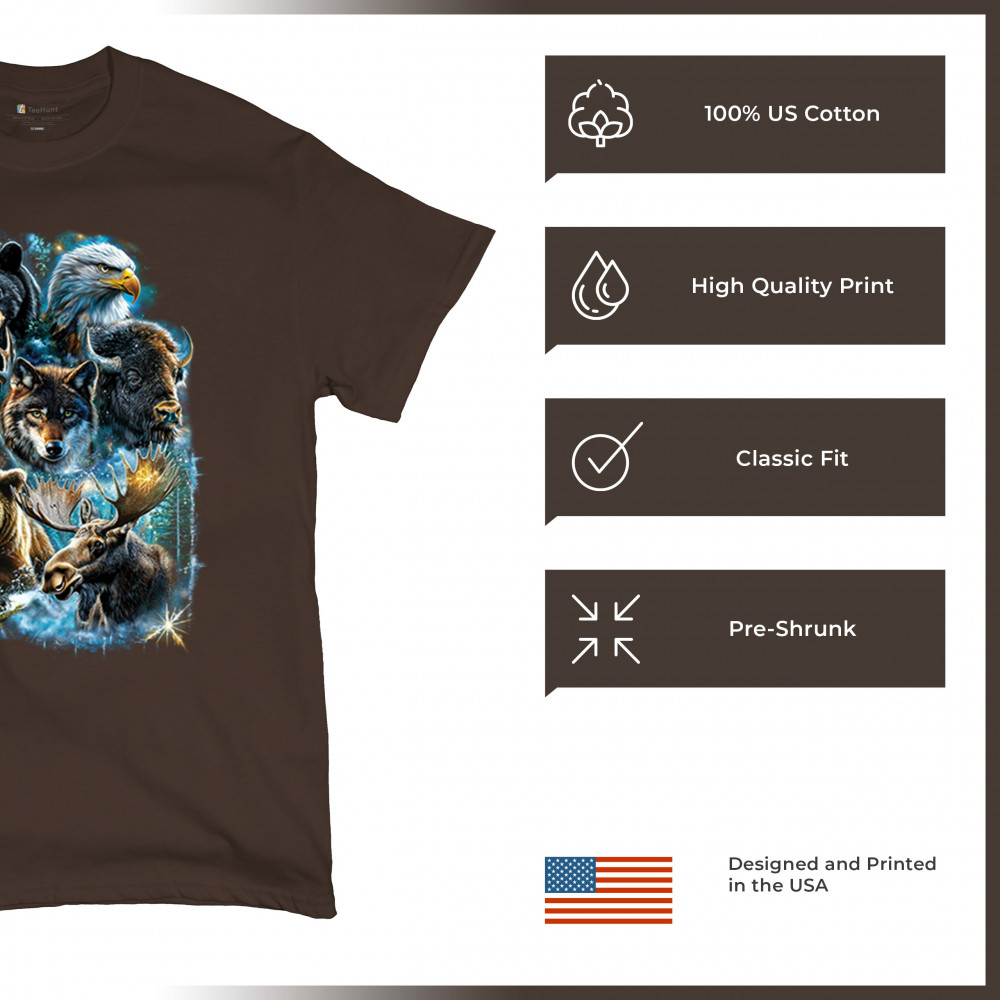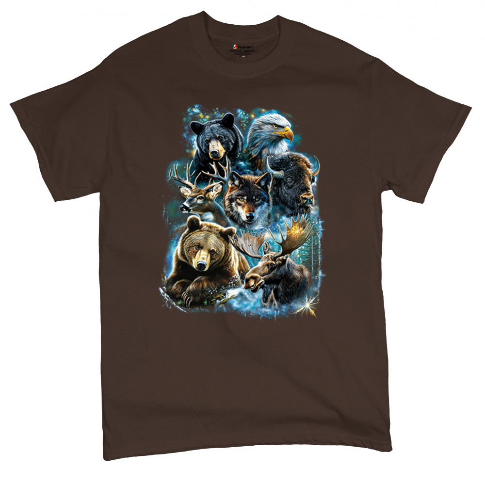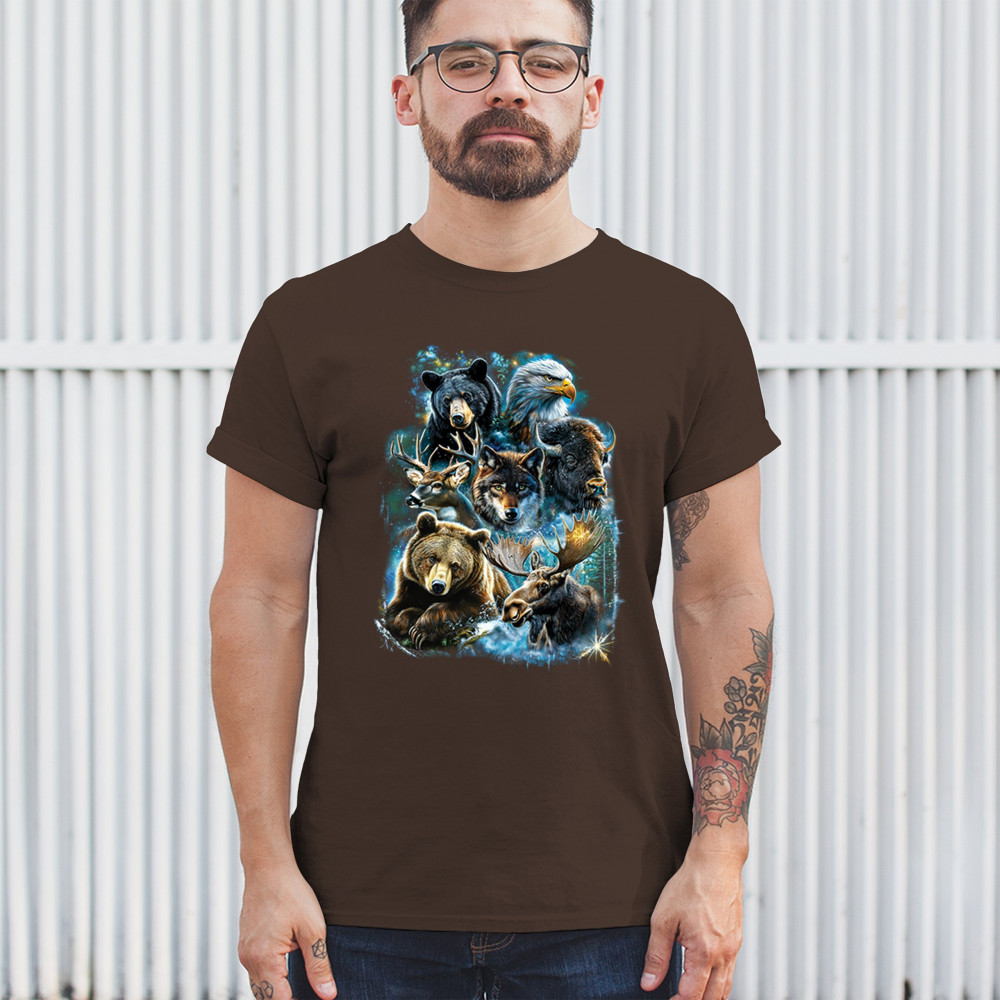 Wilderness design with moose, bear, eagle, bison, and wolf. A bold tribute to forest animals, nature strength, and rugged outdoor spirit.