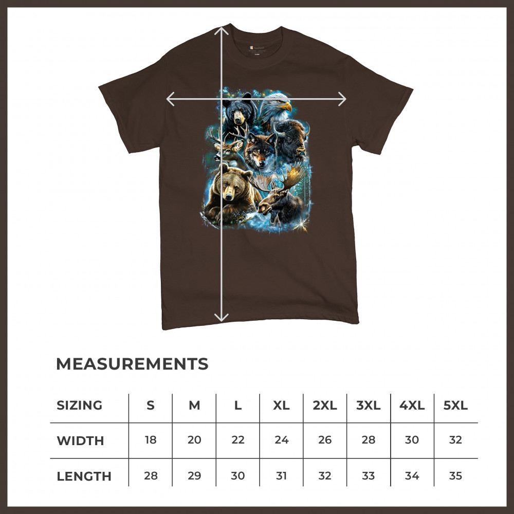 Celebrate the untamed beauty of the wilderness with this powerful design showcasing North America’s most iconic animals—moose, wolf, grizzly, black bear, bison, eagle, and deer. Packed with forest energy and rich detail, this piece honors rugged mountain life, animal strength, and a deep respect for wild nature.
