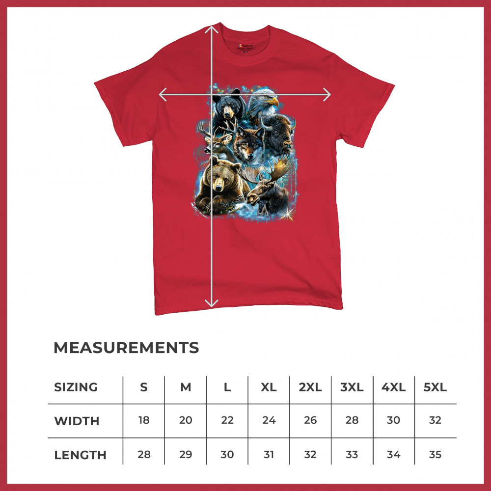 Celebrate the untamed beauty of the wilderness with this powerful design showcasing North America’s most iconic animals—moose, wolf, grizzly, black bear, bison, eagle, and deer. Packed with forest energy and rich detail, this piece honors rugged mountain life, animal strength, and a deep respect for wild nature.
