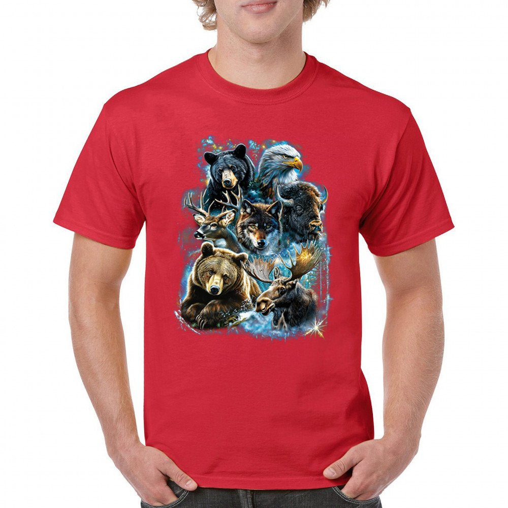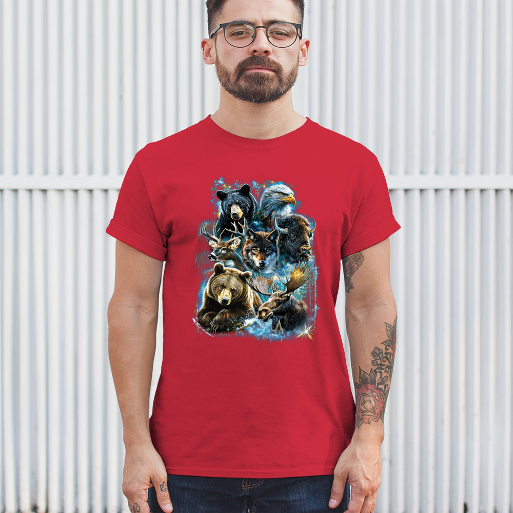 Wilderness design with moose, bear, eagle, bison, and wolf. A bold tribute to forest animals, nature strength, and rugged outdoor spirit.