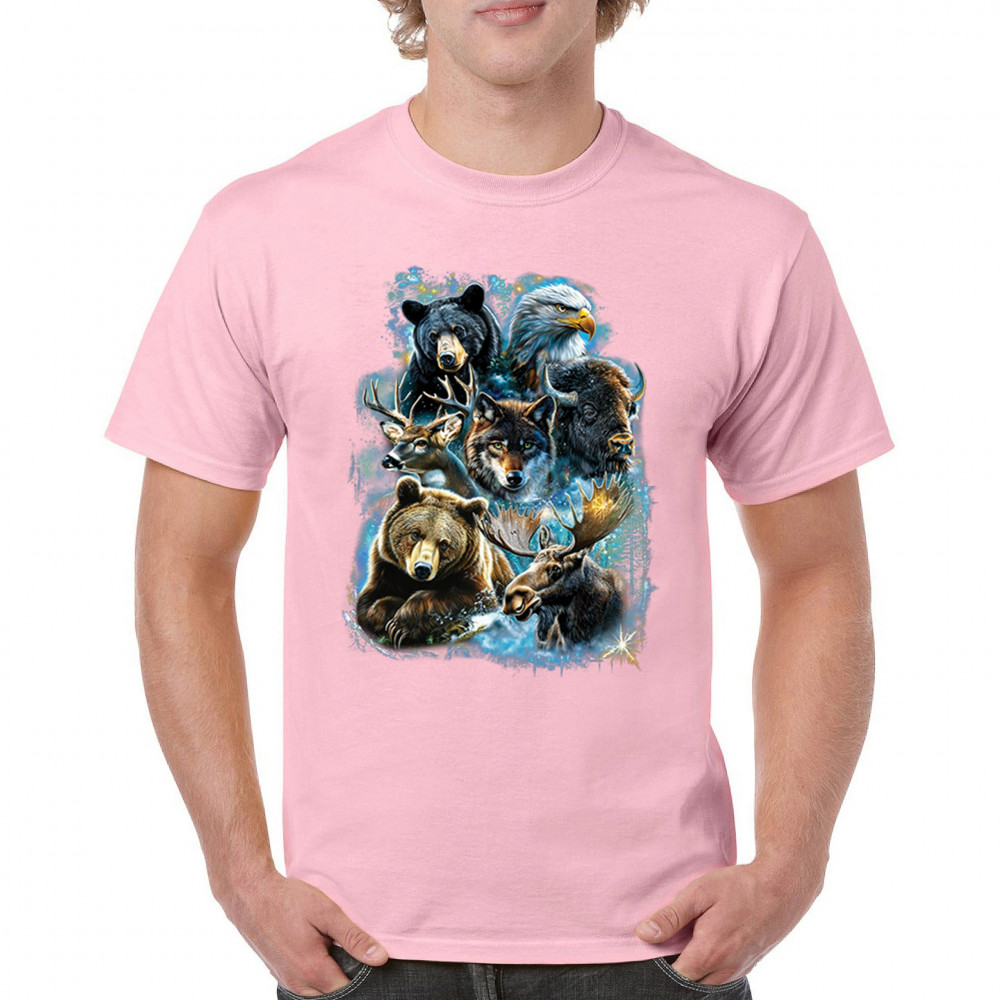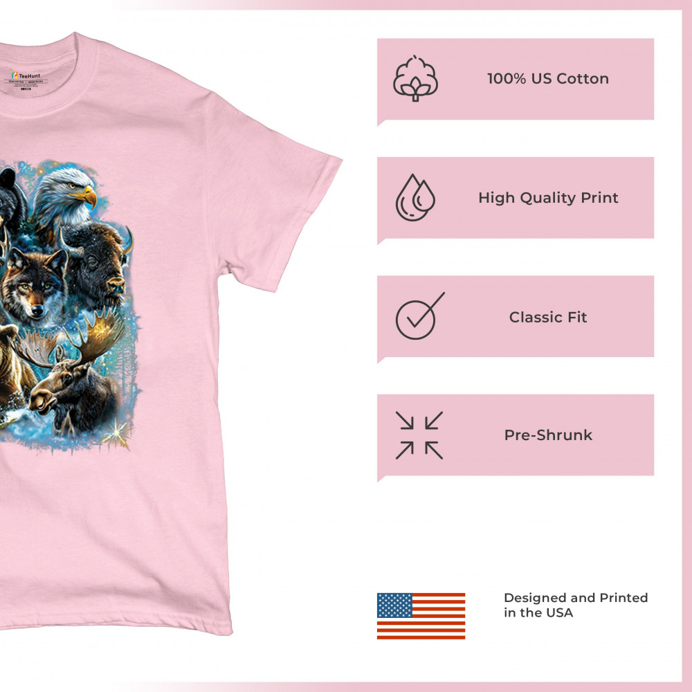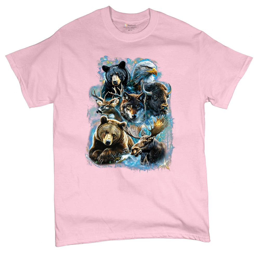 Wilderness design with moose, bear, eagle, bison, and wolf. A bold tribute to forest animals, nature strength, and rugged outdoor spirit.