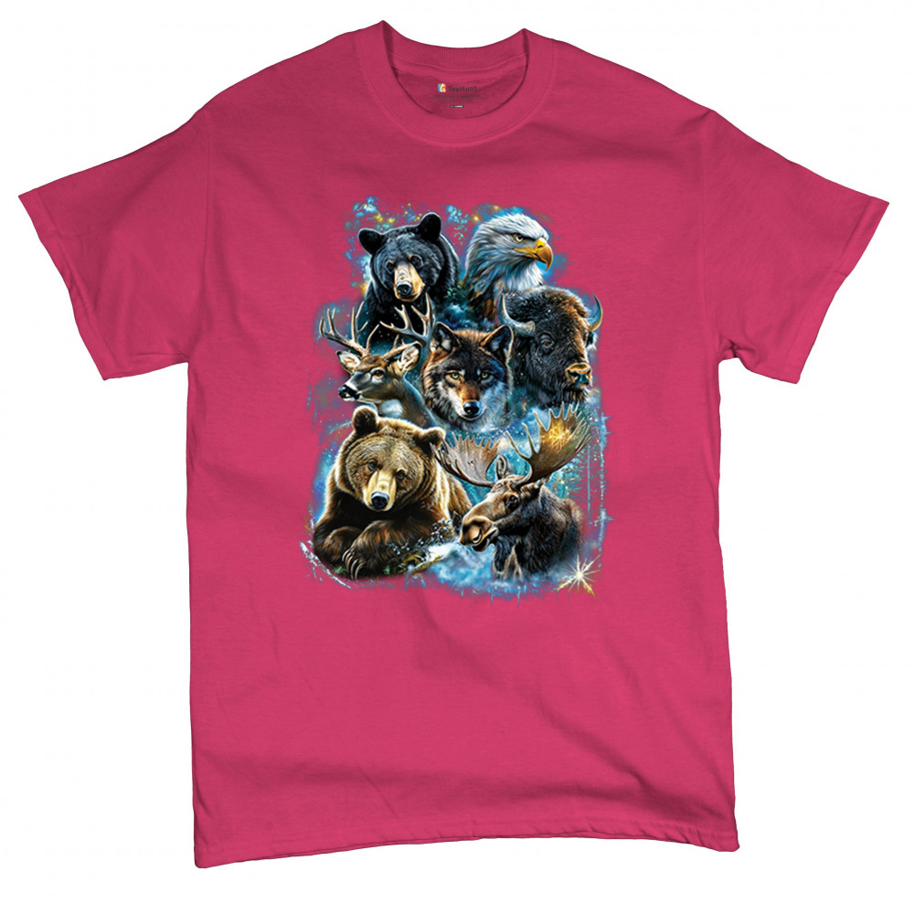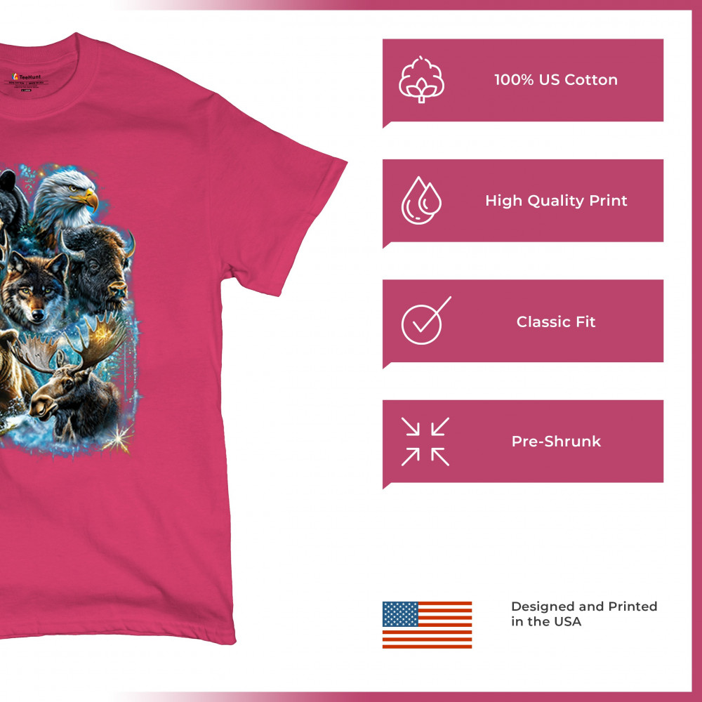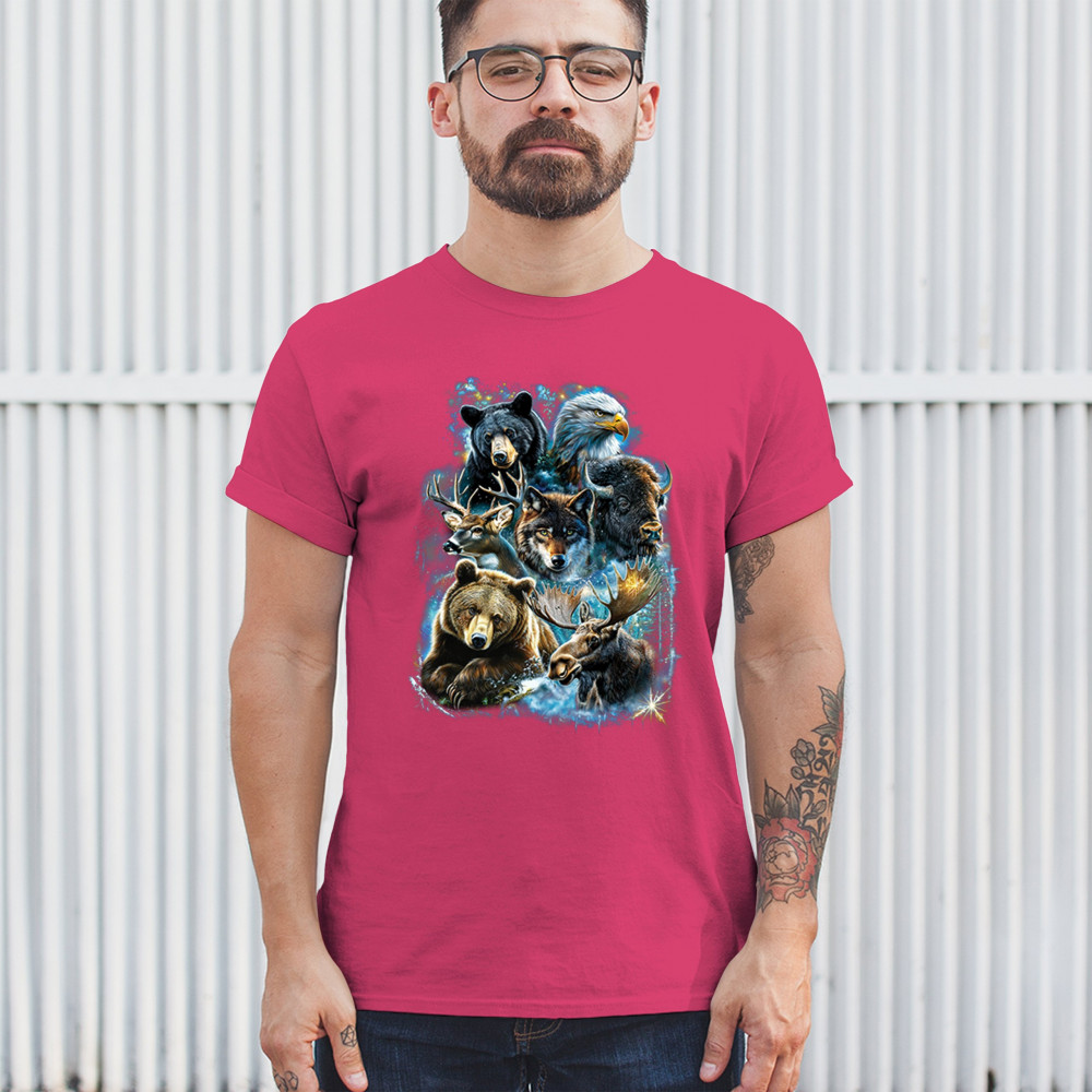 Wilderness design with moose, bear, eagle, bison, and wolf. A bold tribute to forest animals, nature strength, and rugged outdoor spirit.