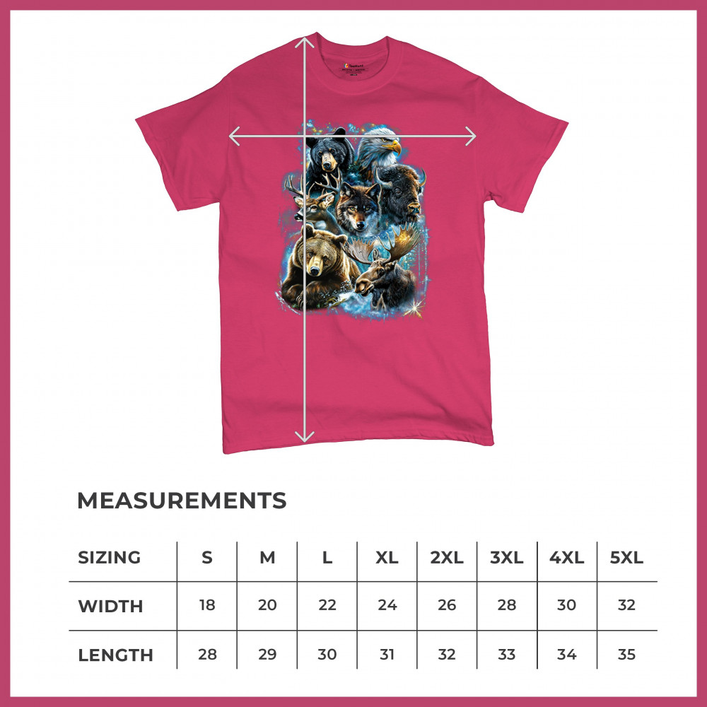 Celebrate the untamed beauty of the wilderness with this powerful design showcasing North America’s most iconic animals—moose, wolf, grizzly, black bear, bison, eagle, and deer. Packed with forest energy and rich detail, this piece honors rugged mountain life, animal strength, and a deep respect for wild nature.