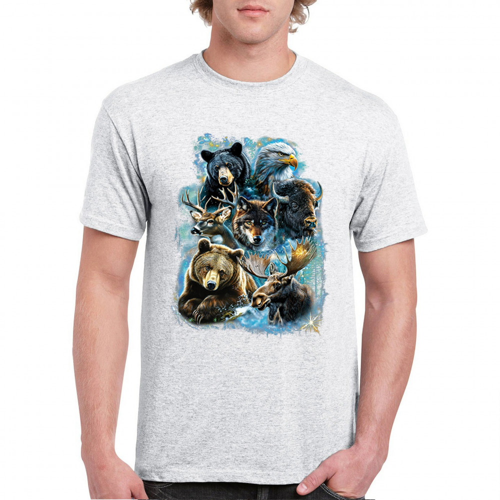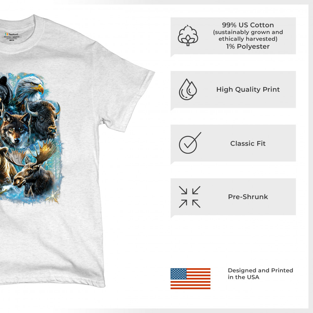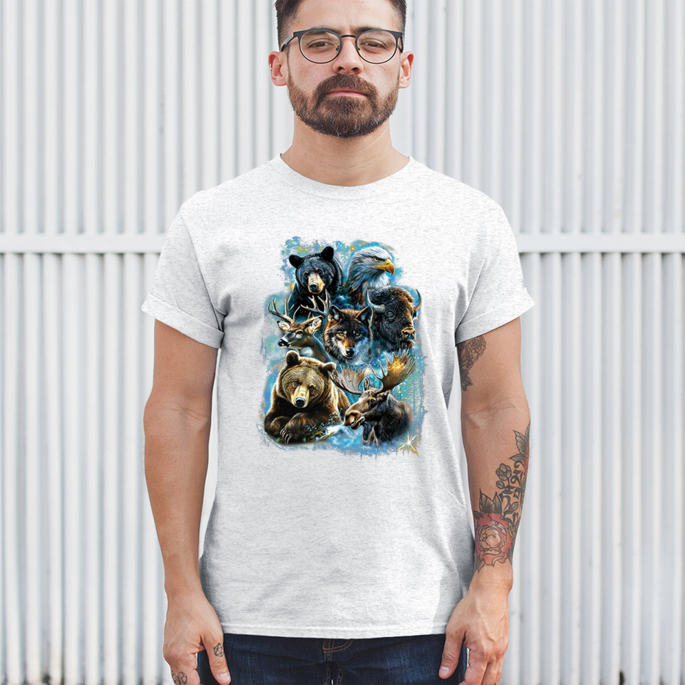 Wilderness design with moose, bear, eagle, bison, and wolf. A bold tribute to forest animals, nature strength, and rugged outdoor spirit.