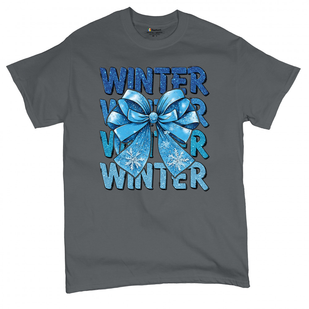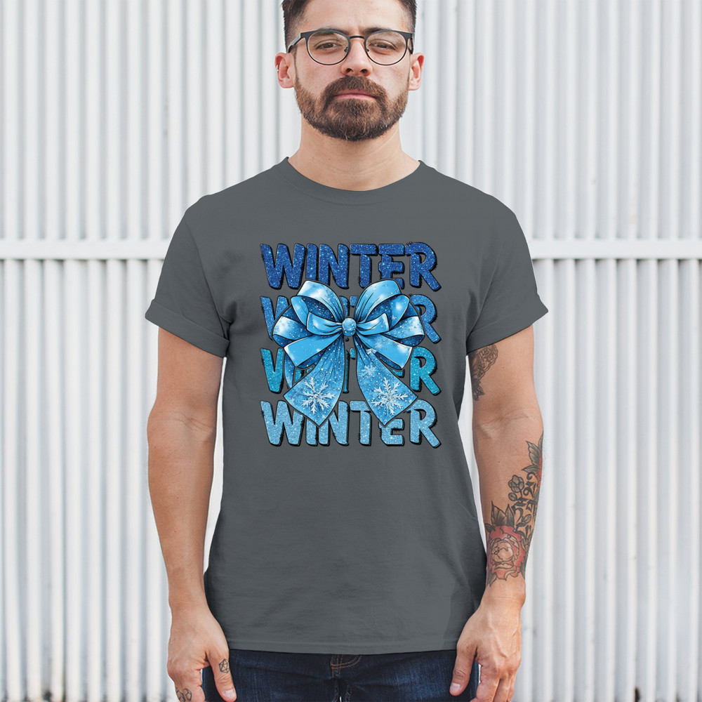 This shimmering winter bow design blends icy blue glitter style with bold repeating WINTER text for a bright seasonal statement. Snowflake accents and frosty tones create a cozy, cheerful vibe perfect for holiday outfits, gifting, or cold-weather lovers. A standout graphic that brings festive winter charm to any wardrobe and boosts seasonal search visibility.