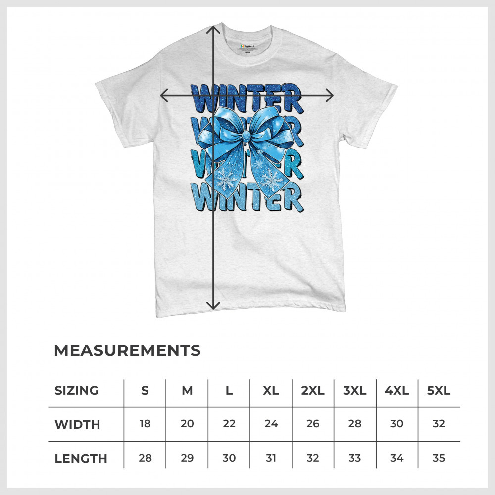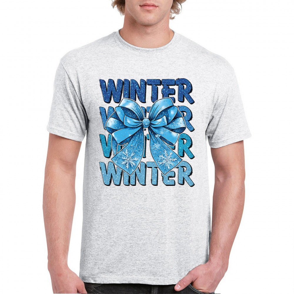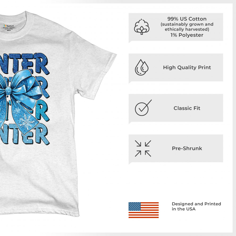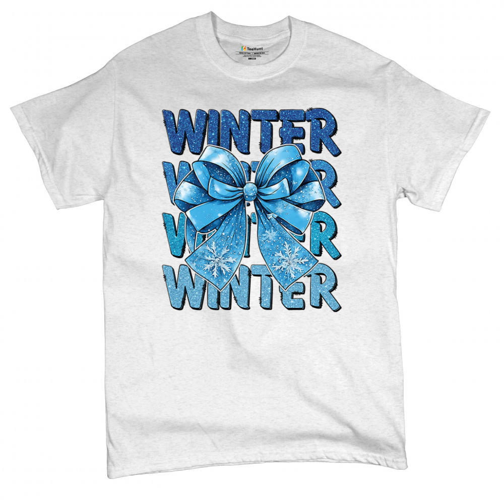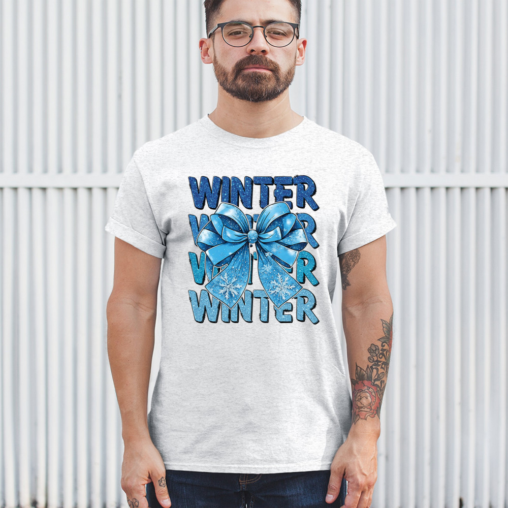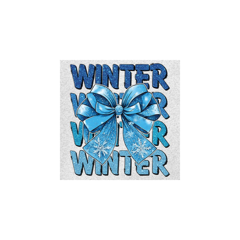 This shimmering winter bow design blends icy blue glitter style with bold repeating WINTER text for a bright seasonal statement. Snowflake accents and frosty tones create a cozy, cheerful vibe perfect for holiday outfits, gifting, or cold-weather lovers. A standout graphic that brings festive winter charm to any wardrobe and boosts seasonal search visibility.