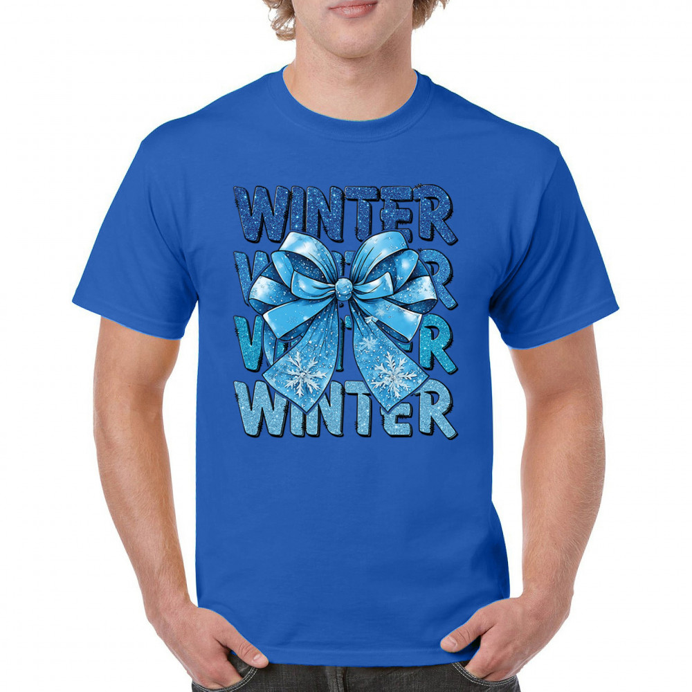 This shimmering winter bow design blends icy blue glitter style with bold repeating WINTER text for a bright seasonal statement. Snowflake accents and frosty tones create a cozy, cheerful vibe perfect for holiday outfits, gifting, or cold-weather lovers. A standout graphic that brings festive winter charm to any wardrobe and boosts seasonal search visibility.