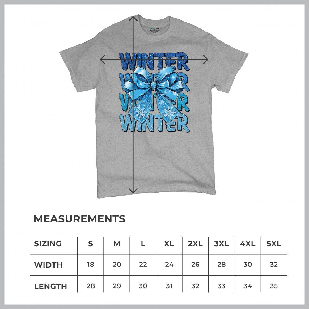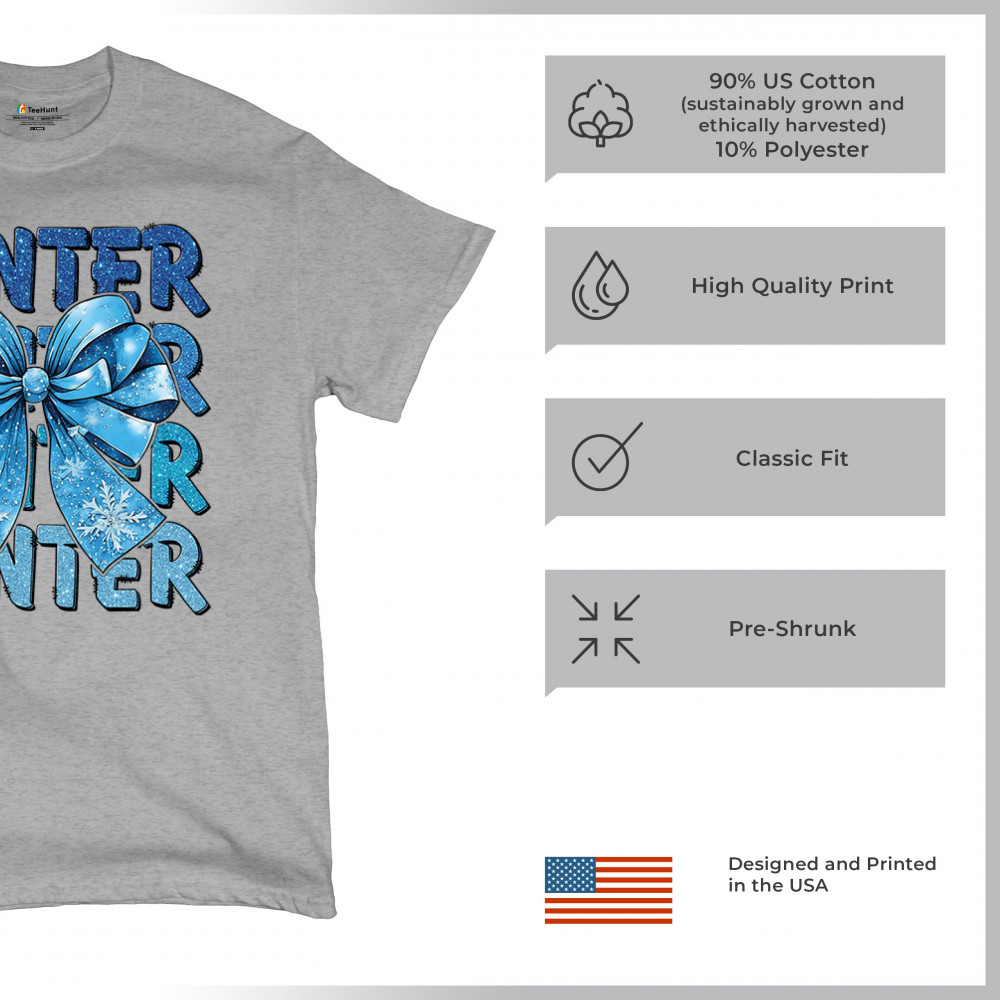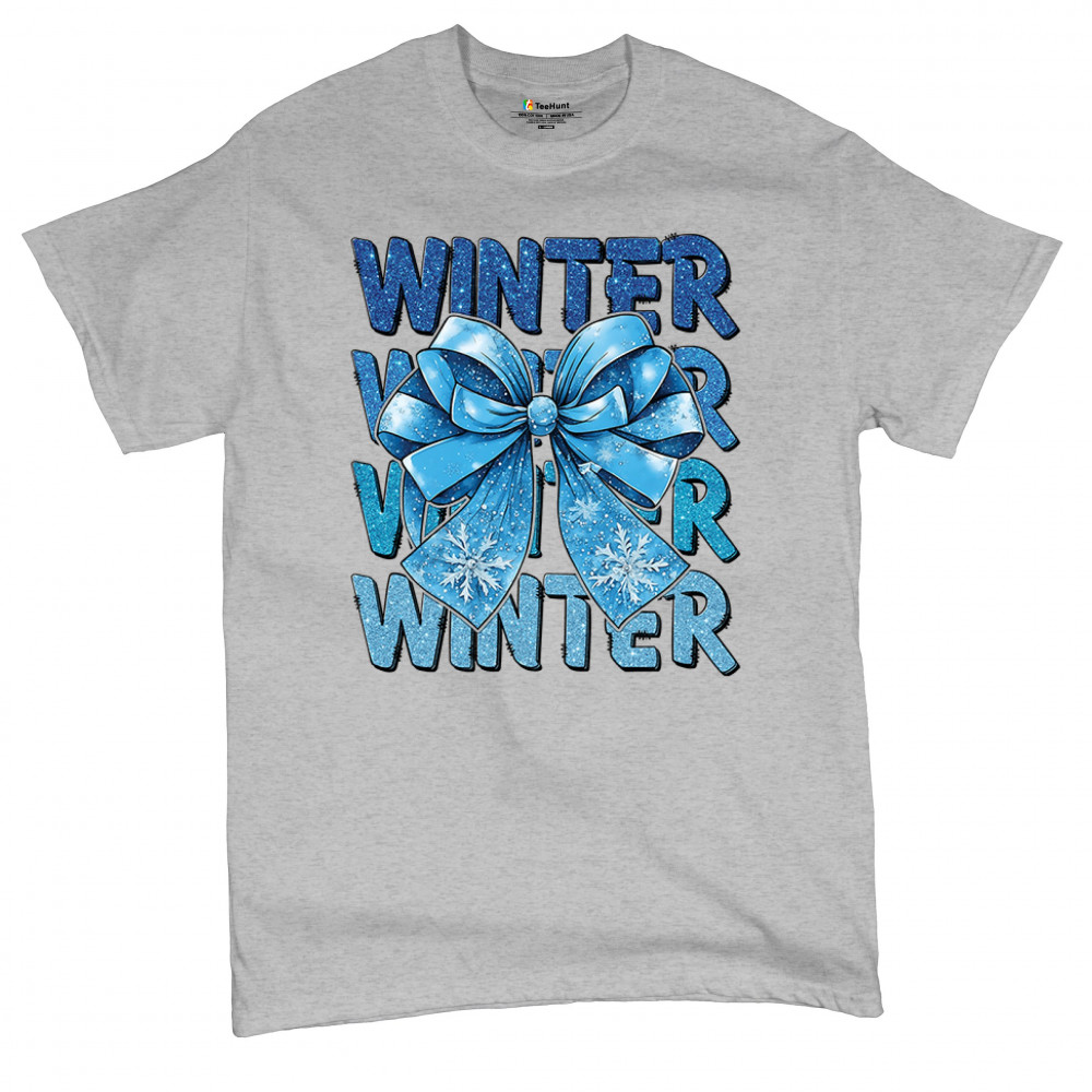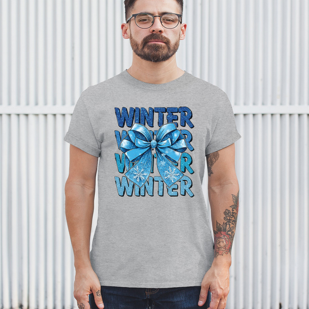 This shimmering winter bow design blends icy blue glitter style with bold repeating WINTER text for a bright seasonal statement. Snowflake accents and frosty tones create a cozy, cheerful vibe perfect for holiday outfits, gifting, or cold-weather lovers. A standout graphic that brings festive winter charm to any wardrobe and boosts seasonal search visibility.