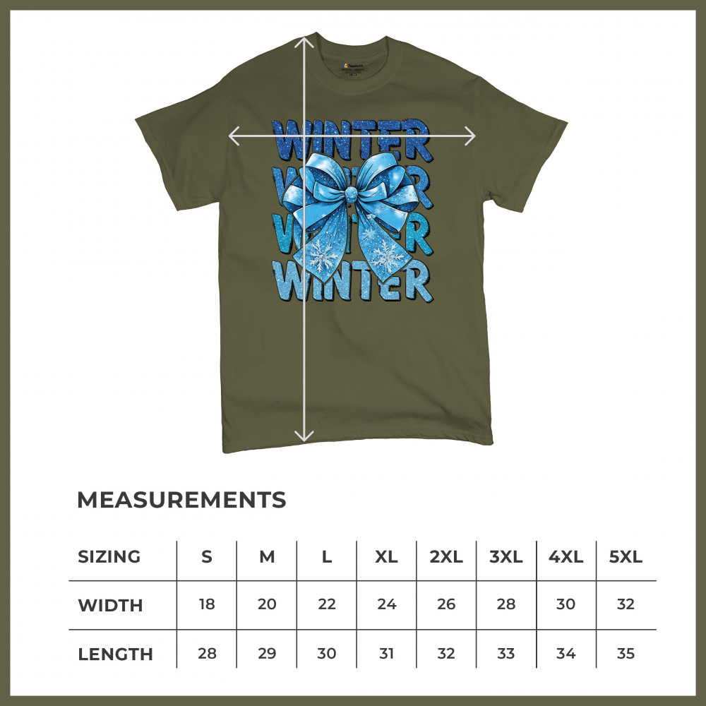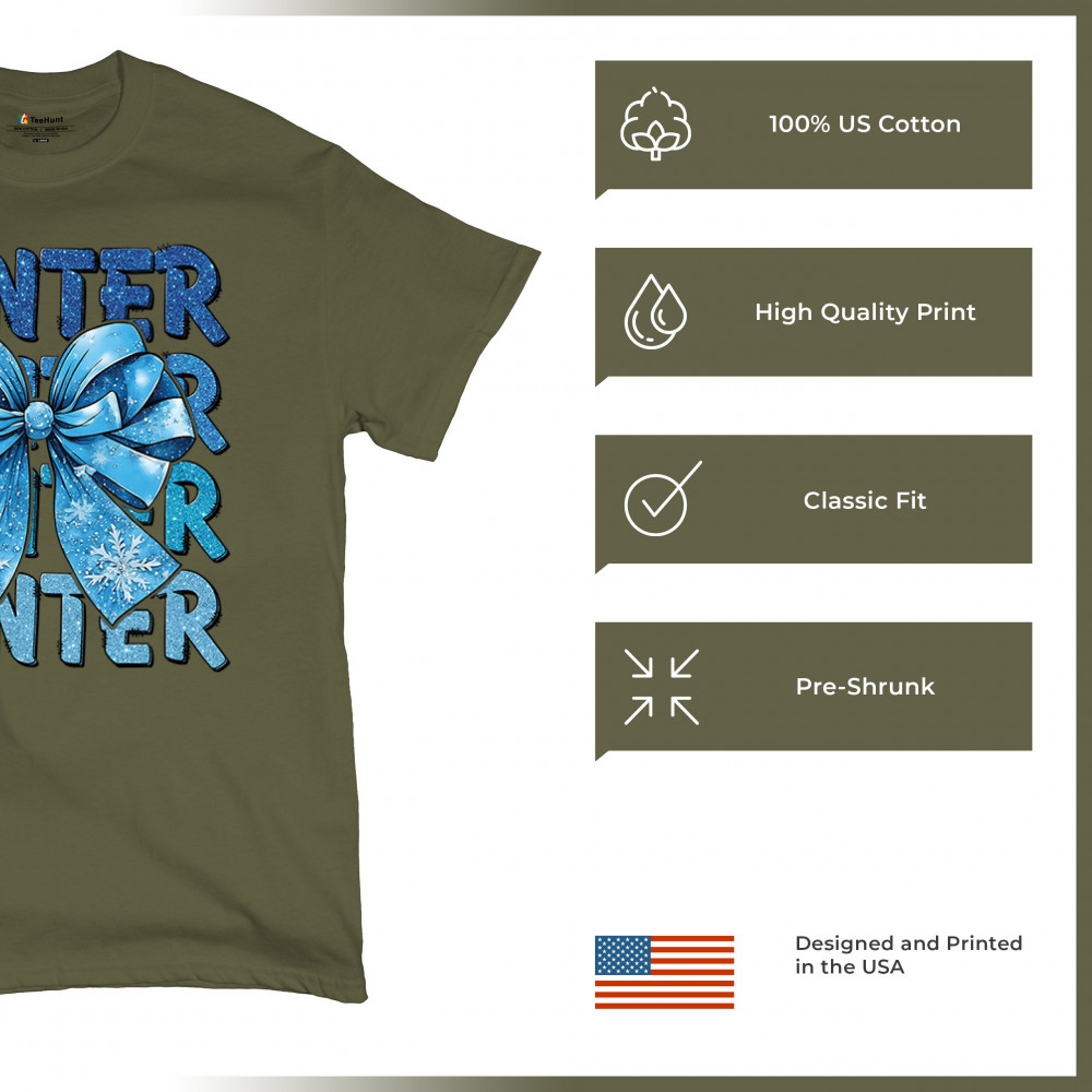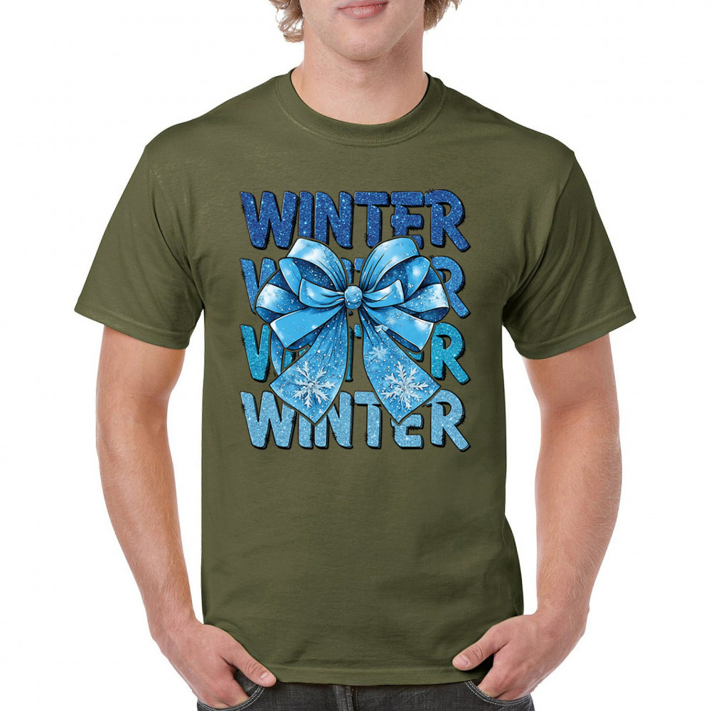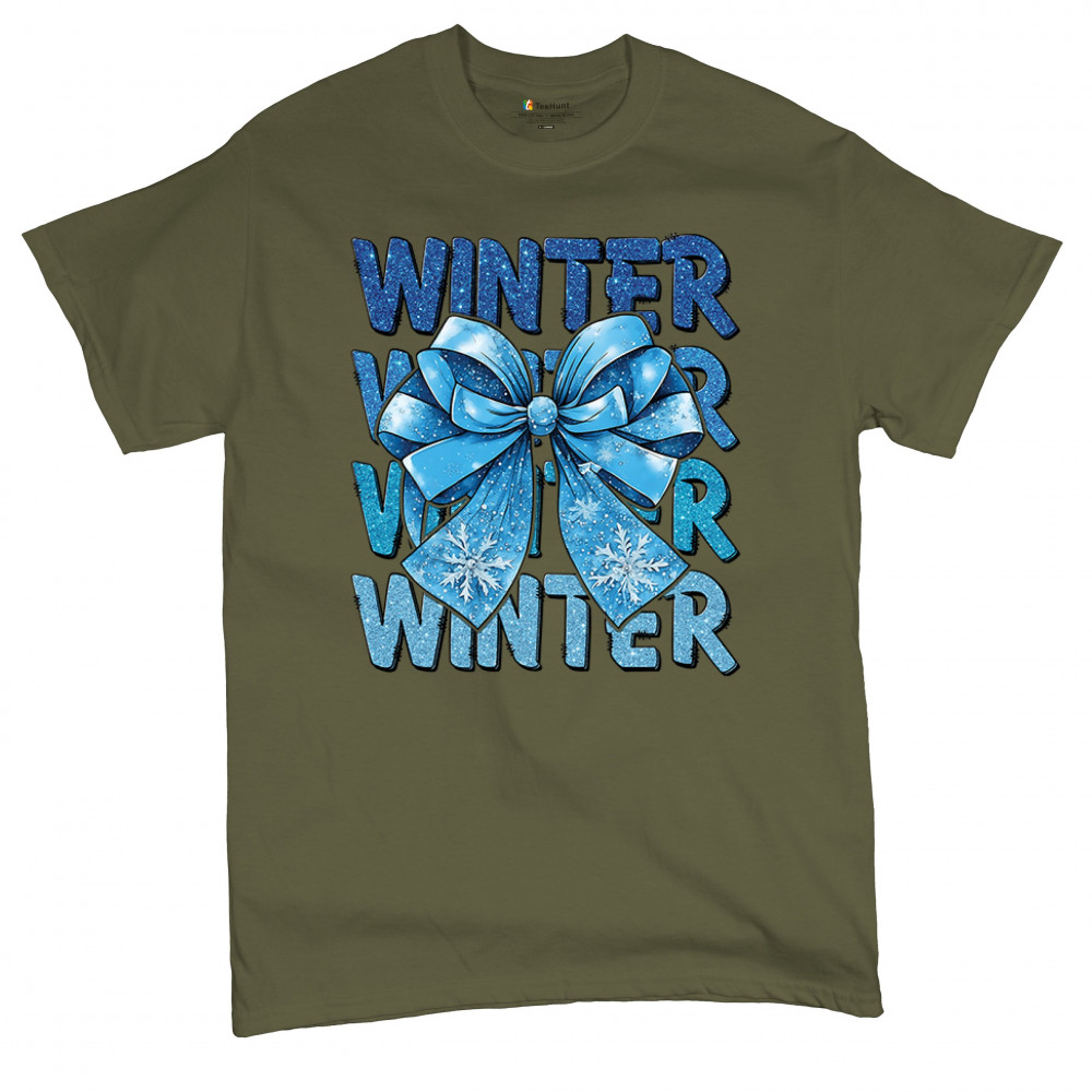 This shimmering winter bow design blends icy blue glitter style with bold repeating WINTER text for a bright seasonal statement. Snowflake accents and frosty tones create a cozy, cheerful vibe perfect for holiday outfits, gifting, or cold-weather lovers. A standout graphic that brings festive winter charm to any wardrobe and boosts seasonal search visibility.