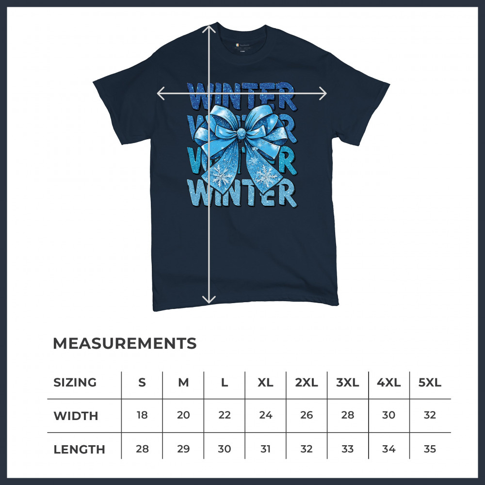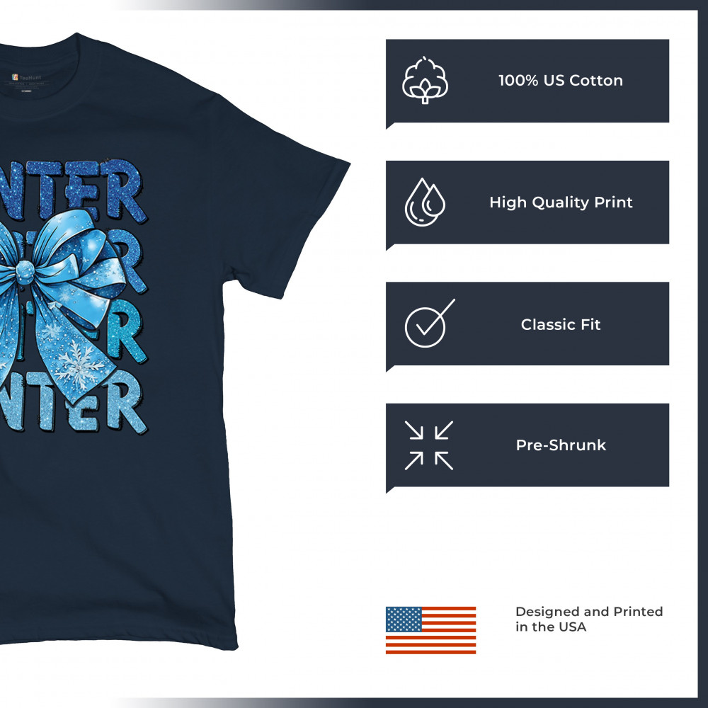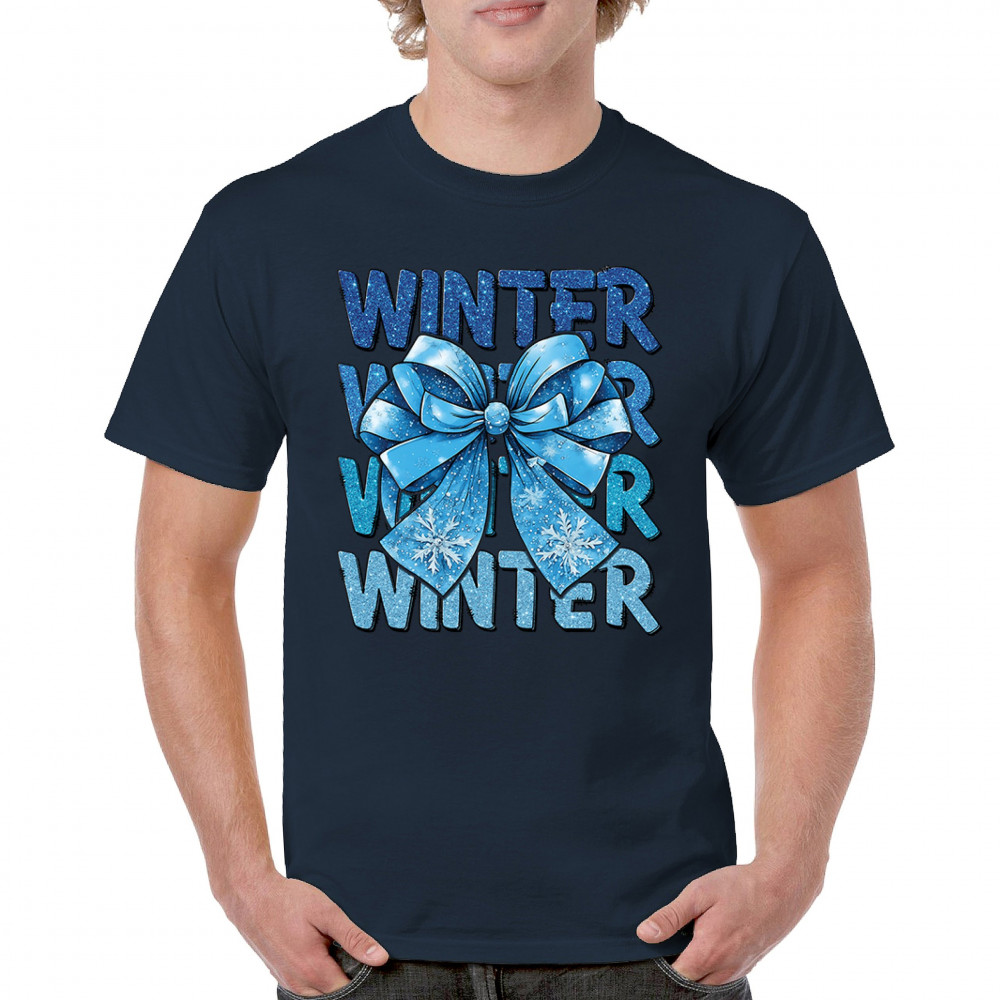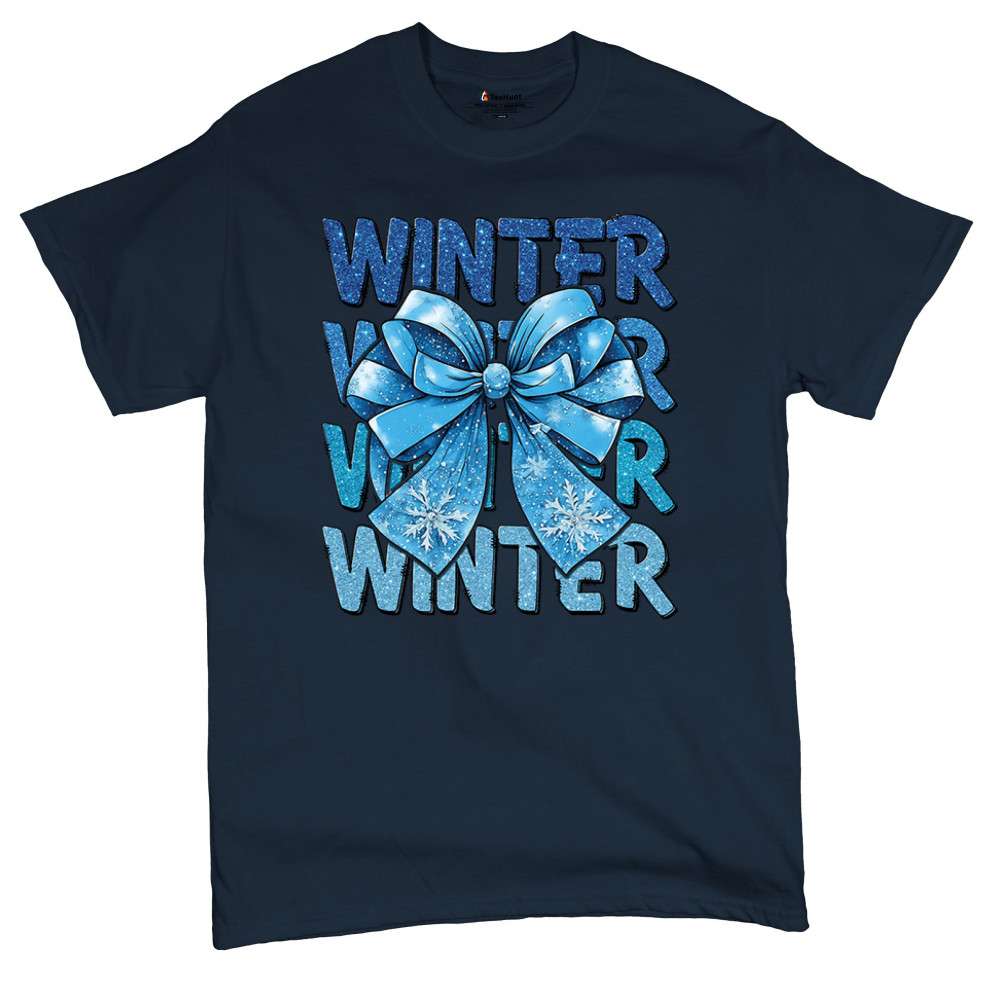 This shimmering winter bow design blends icy blue glitter style with bold repeating WINTER text for a bright seasonal statement. Snowflake accents and frosty tones create a cozy, cheerful vibe perfect for holiday outfits, gifting, or cold-weather lovers. A standout graphic that brings festive winter charm to any wardrobe and boosts seasonal search visibility.