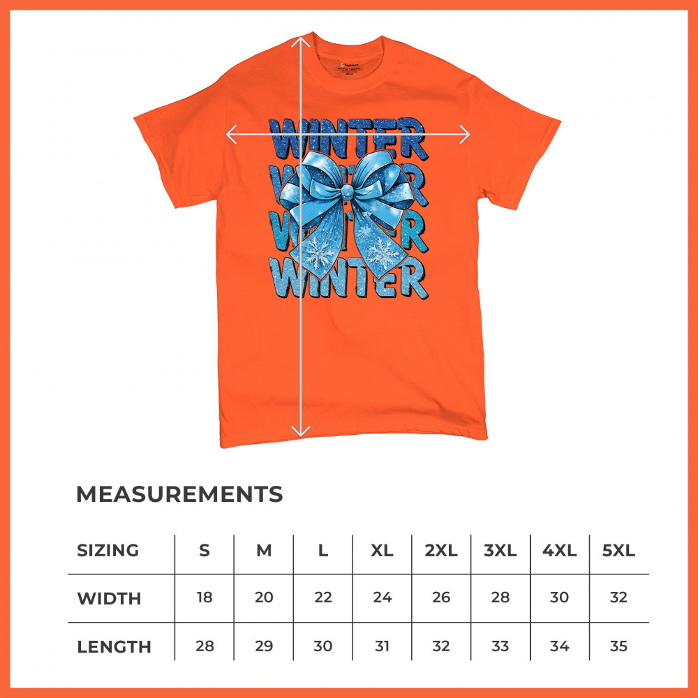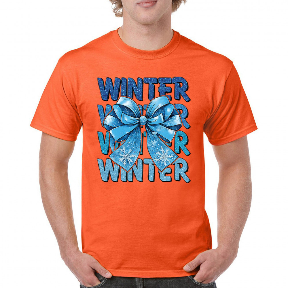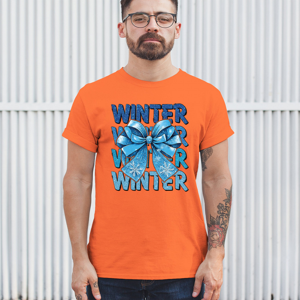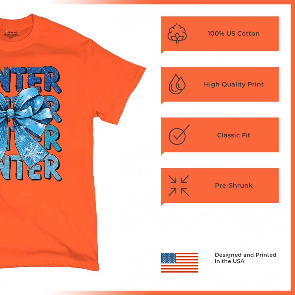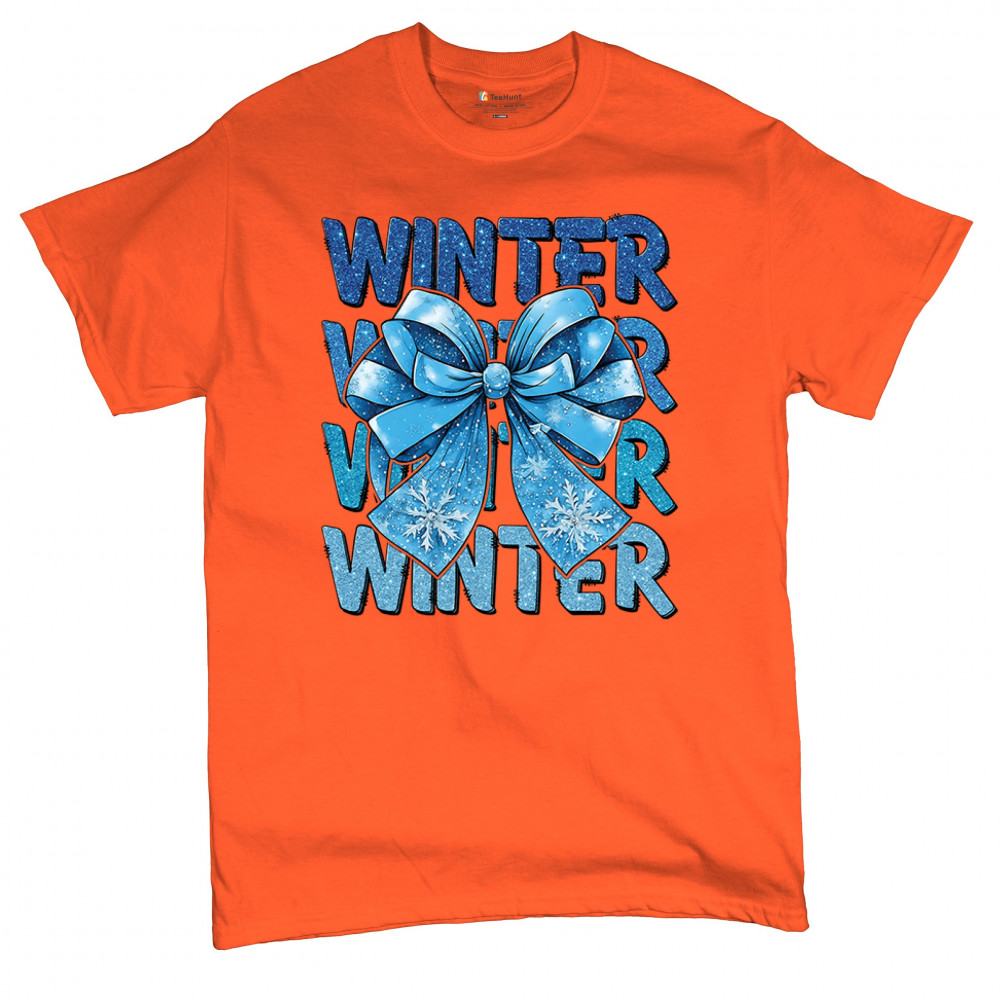 This shimmering winter bow design blends icy blue glitter style with bold repeating WINTER text for a bright seasonal statement. Snowflake accents and frosty tones create a cozy, cheerful vibe perfect for holiday outfits, gifting, or cold-weather lovers. A standout graphic that brings festive winter charm to any wardrobe and boosts seasonal search visibility.
