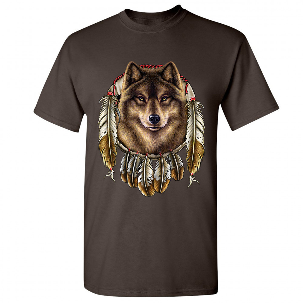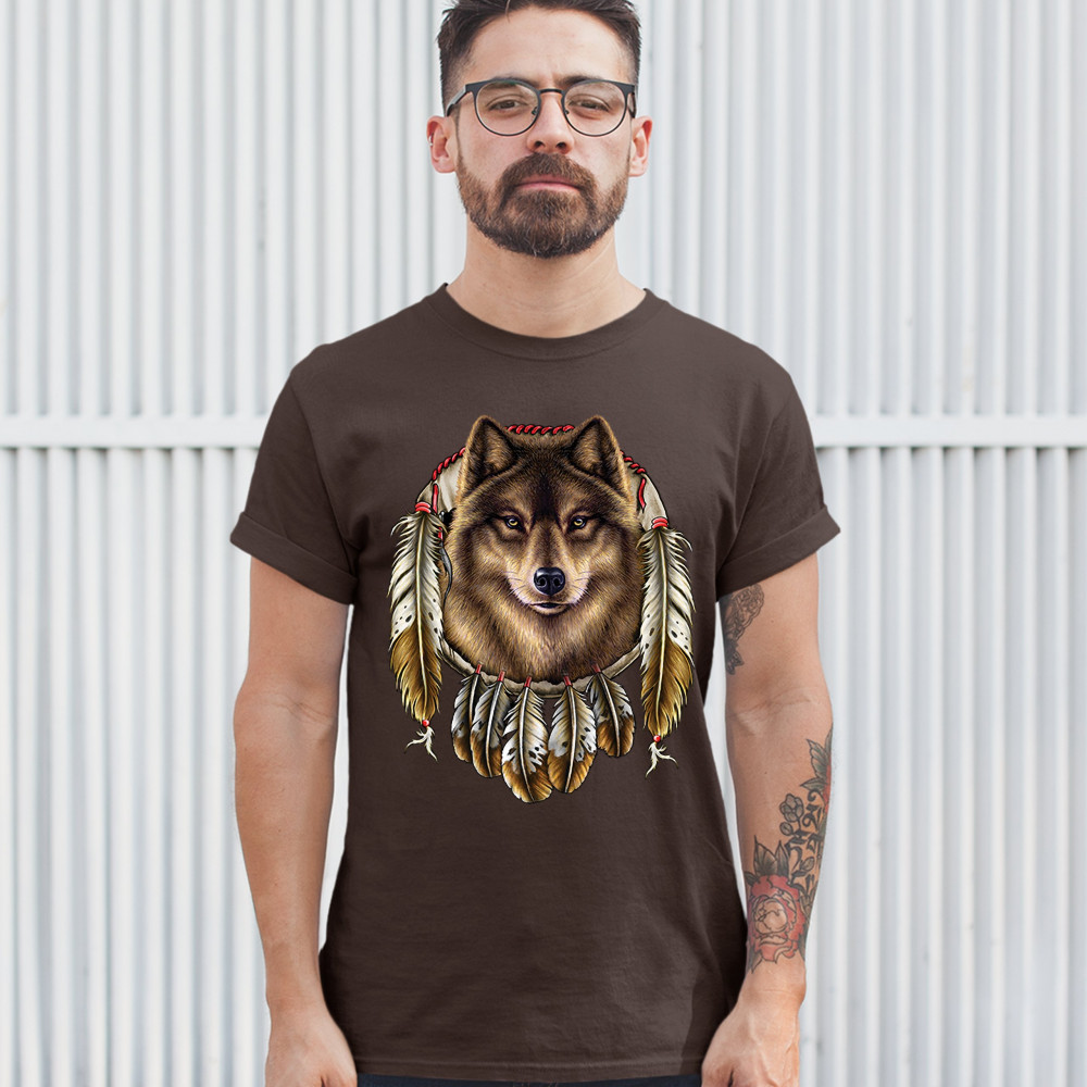 WOLF SPIRIT t-shirt native american dreamcatcher indigenous men's tee brown