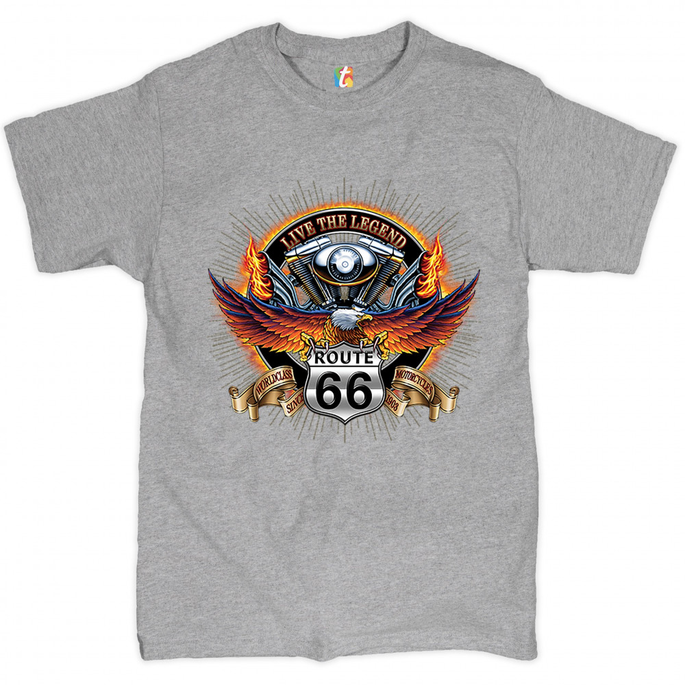 A print featuring an American bald eagle spreading it's wings while sitting on a "Route 66" sign. On a stripe behind the sign it says: "worldclass motorcycles since 1903". In the background there is a motorcycle engine with words: "live the legend" above