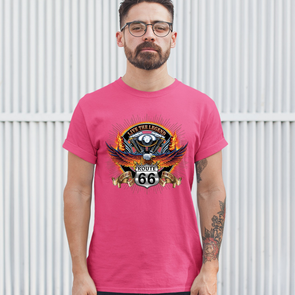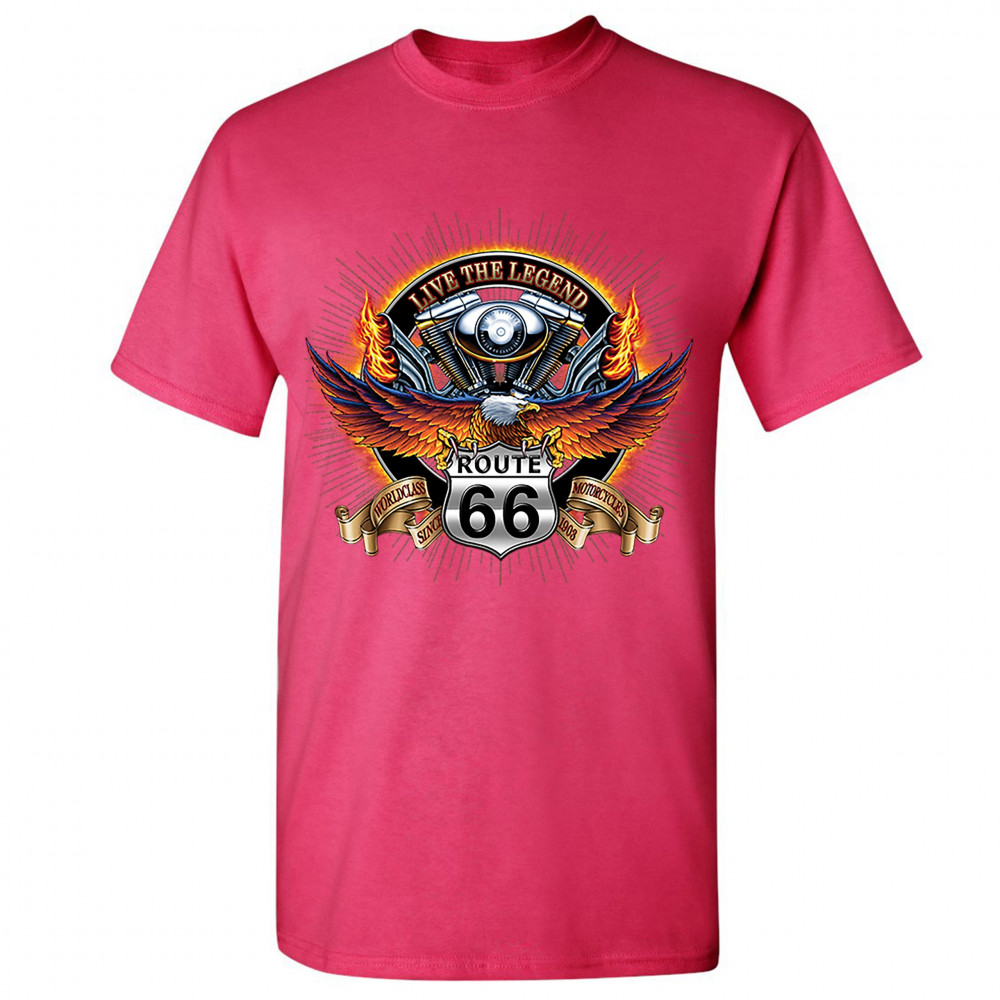 A print featuring an American bald eagle spreading it's wings while sitting on a "Route 66" sign. On a stripe behind the sign it says: "worldclass motorcycles since 1903". In the background there is a motorcycle engine with words: "live the legend" above