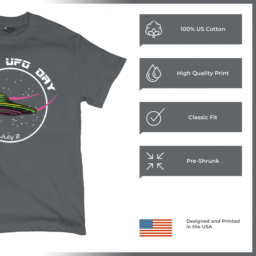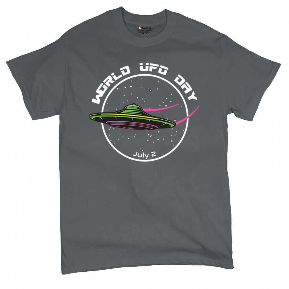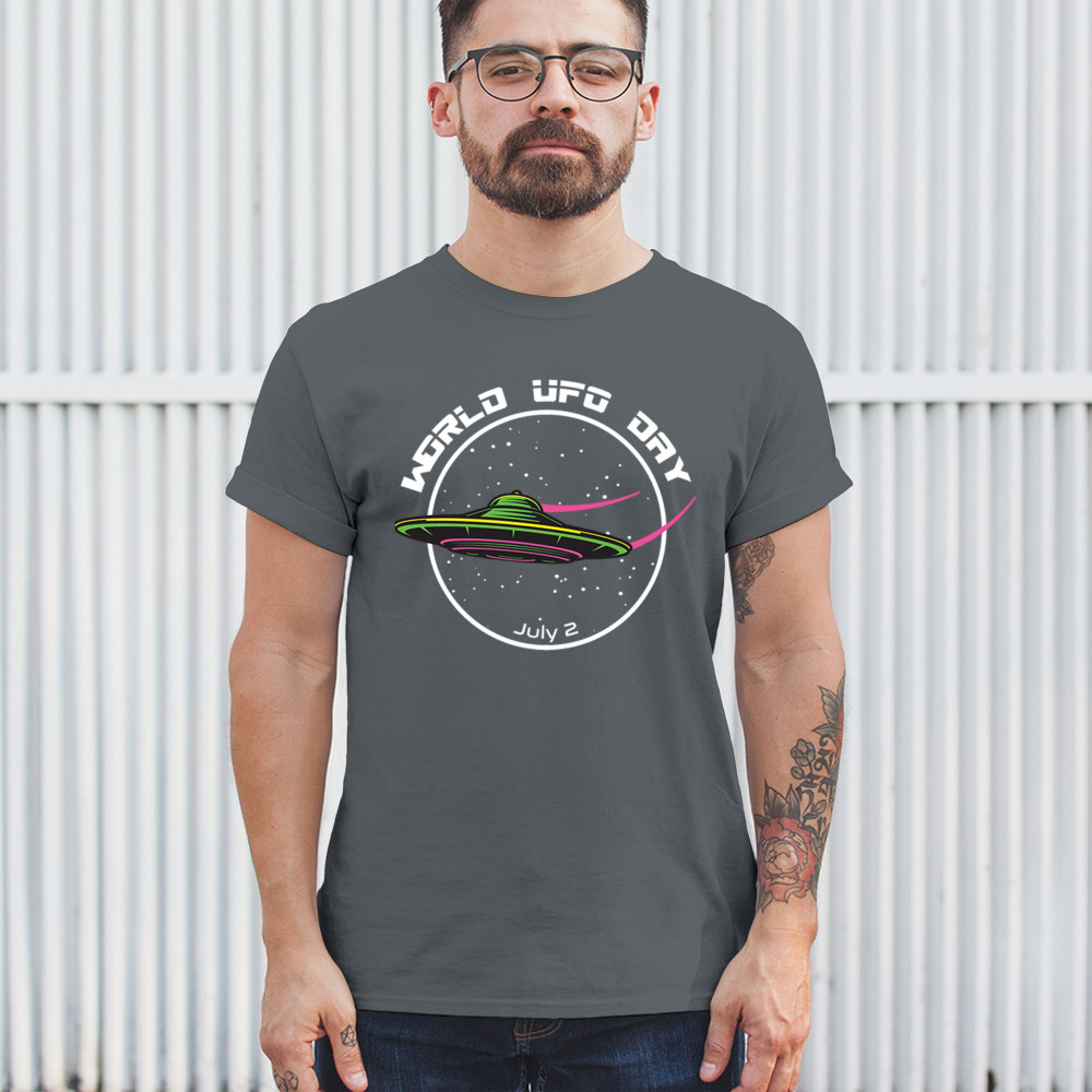 Celebrate World UFO Day on July 2nd with a captivating design featuring a sleek UFO against a starry sky. Perfect for space enthusiasts and UFO lovers.
