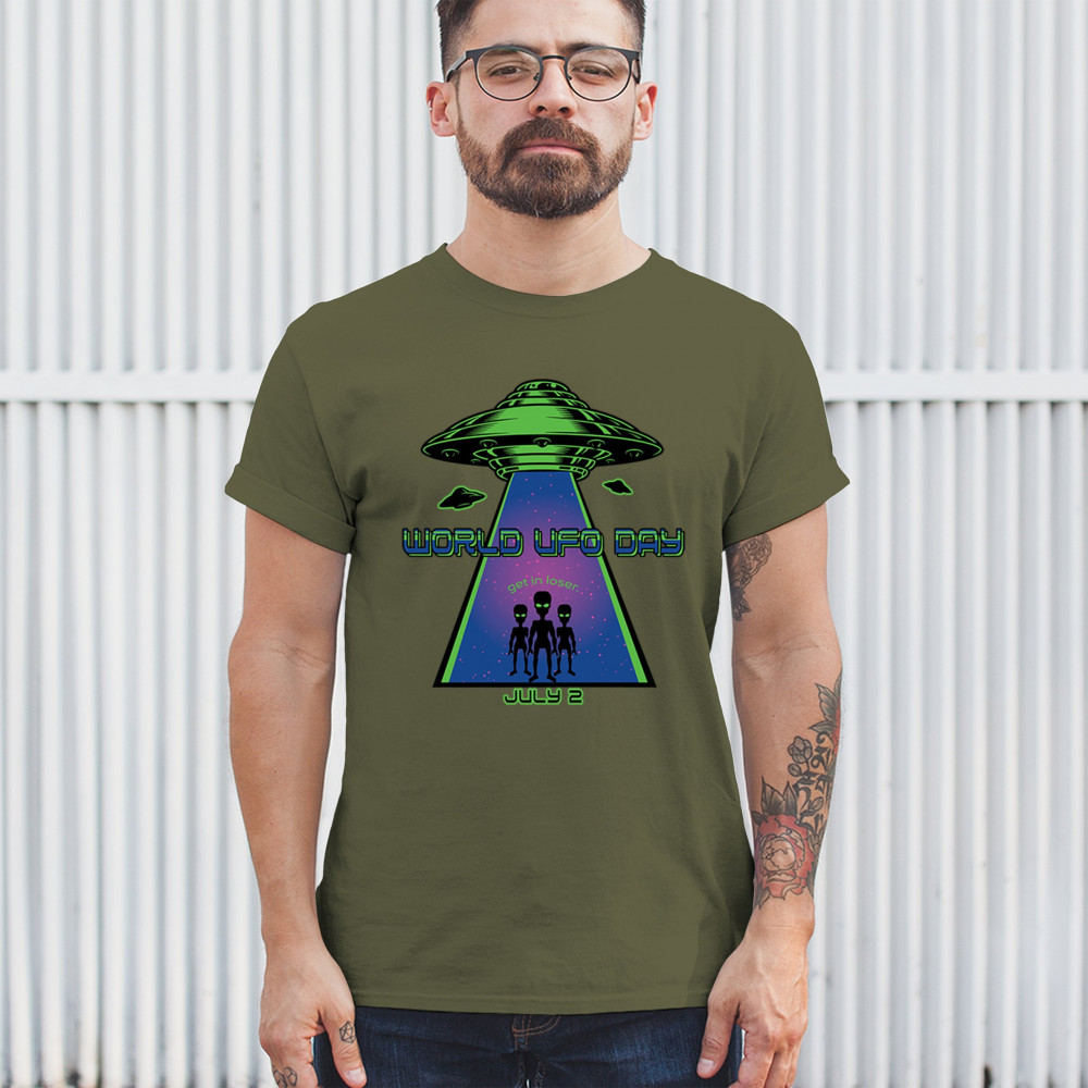 Join the celebration of World UFO Day with this unique design, featuring a detailed UFO beaming up three cheerful aliens with the phrase "Get in, loser." Perfect for those who are fascinated by the unknown and have a sense of humor about extraterrestrial life. Whether you're attending a UFO event, meeting with fellow enthusiasts, or just want to express your quirky style, this design is a must-have. Embrace the spirit of curiosity and fun with this eye-catching design for July 2nd.