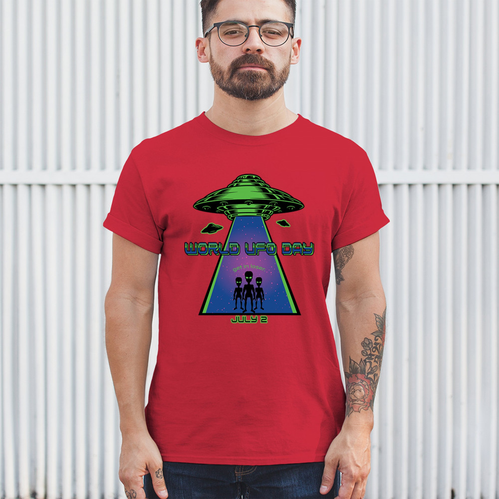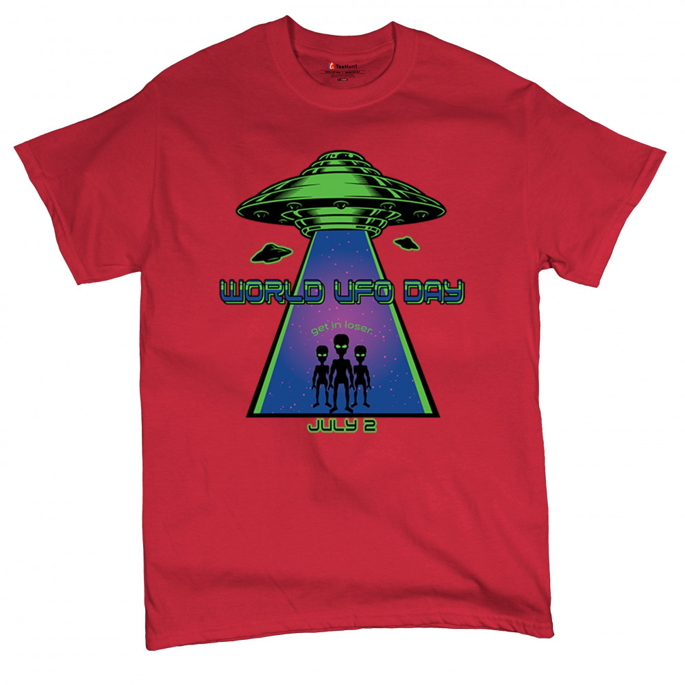 Join the celebration of World UFO Day with this unique design, featuring a detailed UFO beaming up three cheerful aliens with the phrase "Get in, loser." Perfect for those who are fascinated by the unknown and have a sense of humor about extraterrestrial life. Whether you're attending a UFO event, meeting with fellow enthusiasts, or just want to express your quirky style, this design is a must-have. Embrace the spirit of curiosity and fun with this eye-catching design for July 2nd.