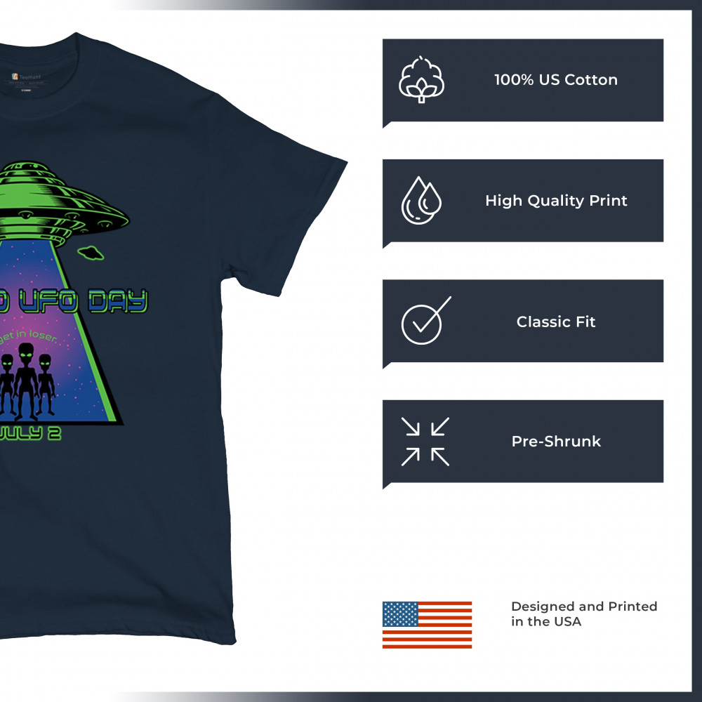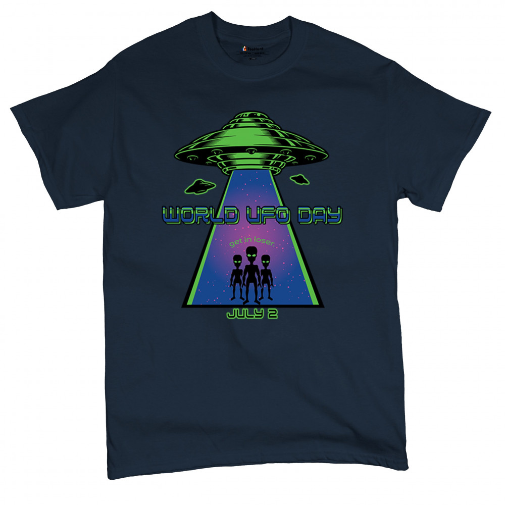 Join the celebration of World UFO Day with this unique design, featuring a detailed UFO beaming up three cheerful aliens with the phrase "Get in, loser." Perfect for those who are fascinated by the unknown and have a sense of humor about extraterrestrial life. Whether you're attending a UFO event, meeting with fellow enthusiasts, or just want to express your quirky style, this design is a must-have. Embrace the spirit of curiosity and fun with this eye-catching design for July 2nd.