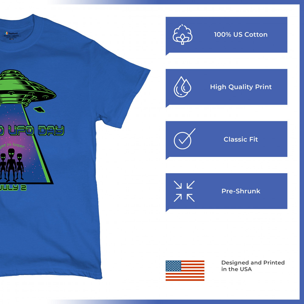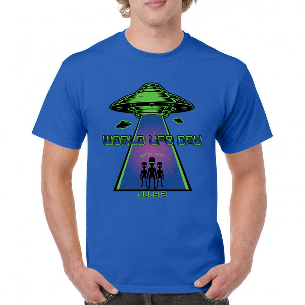 Join the celebration of World UFO Day with this unique design, featuring a detailed UFO beaming up three cheerful aliens with the phrase "Get in, loser." Perfect for those who are fascinated by the unknown and have a sense of humor about extraterrestrial life. Whether you're attending a UFO event, meeting with fellow enthusiasts, or just want to express your quirky style, this design is a must-have. Embrace the spirit of curiosity and fun with this eye-catching design for July 2nd.