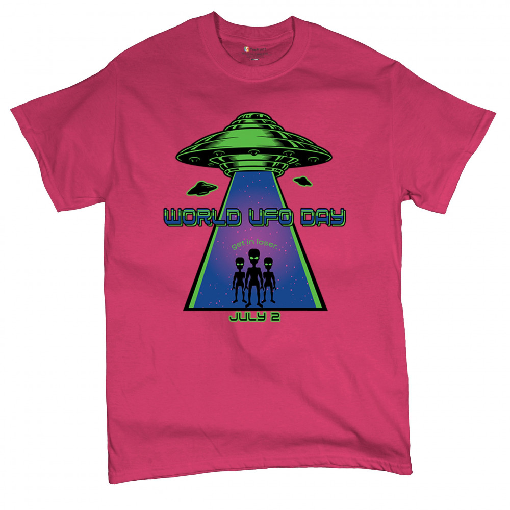 Celebrate World UFO Day with a vibrant design featuring a UFO and three playful aliens with "Get in, loser." Perfect for UFO enthusiasts and alien humor lovers.