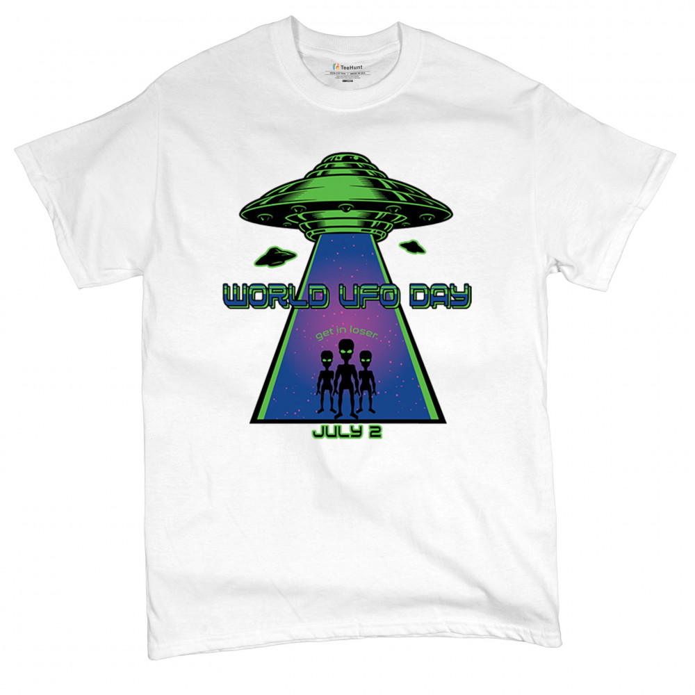 Celebrate World UFO Day with a vibrant design featuring a UFO and three playful aliens with "Get in, loser." Perfect for UFO enthusiasts and alien humor lovers.