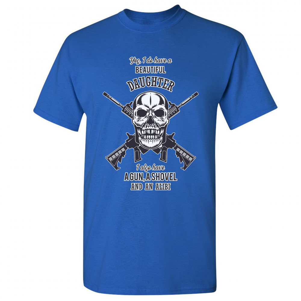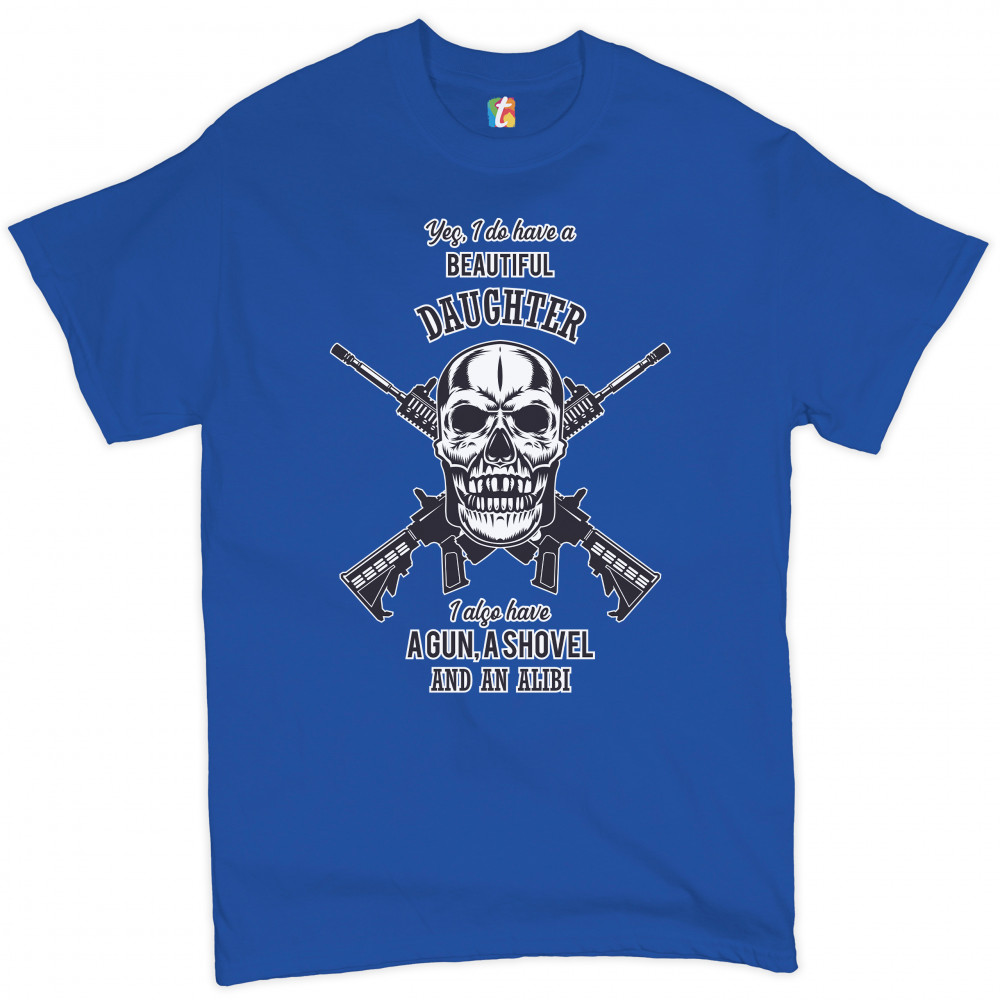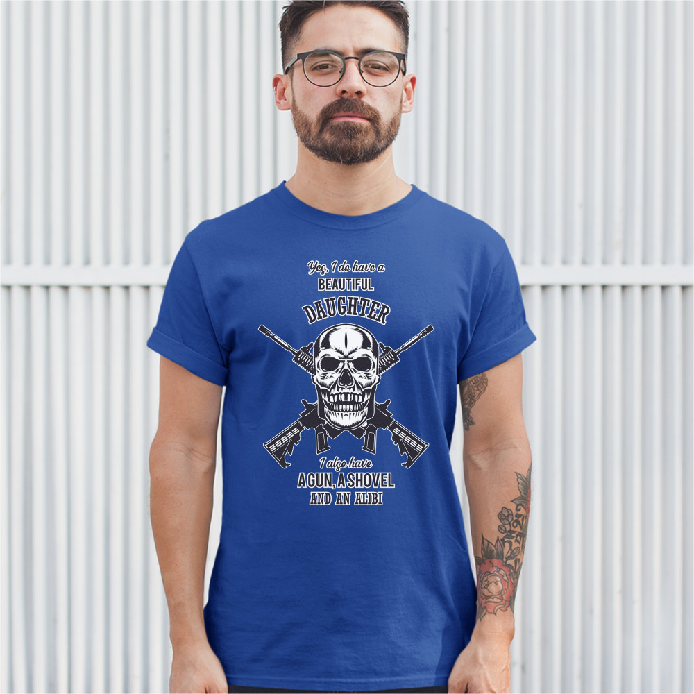 A funny print featuring a scary skull facing forward; behind it there are two crossed rifles. The print says: "Yes, I do have a beautiful daughter. I also have a gun, a shovel and an alibi". Great choice as a gift for Father's Day celebration.
