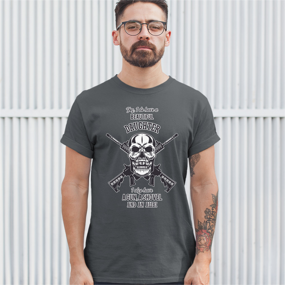 A funny print featuring a scary skull facing forward; behind it there are two crossed rifles. The print says: "Yes, I do have a beautiful daughter. I also have a gun, a shovel and an alibi". Great choice as a gift for Father's Day celebration.