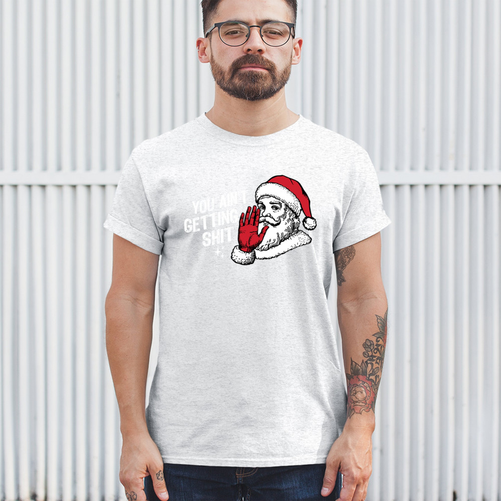 Funny Santa Christmas design with sarcastic Grumpy humor, Merry Xmas parody, Let It Snow style, Jingle Bells laughs, and Christmas tree vibes.