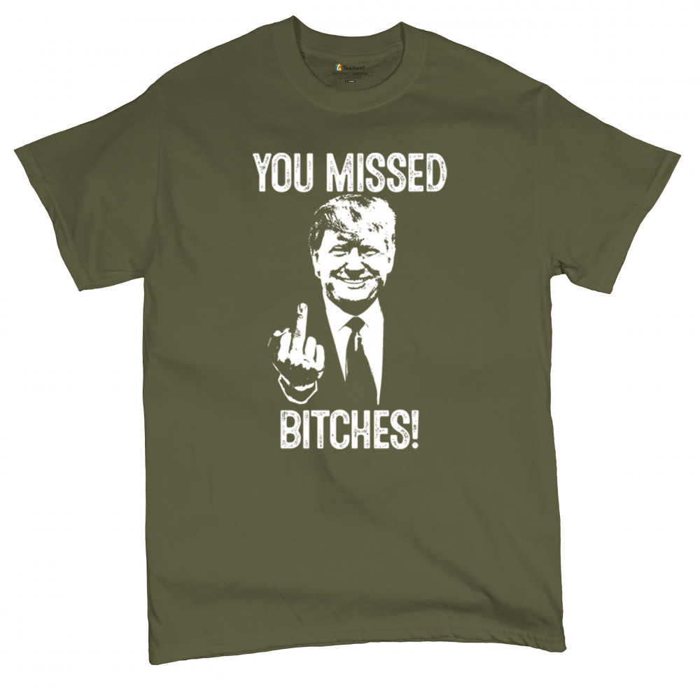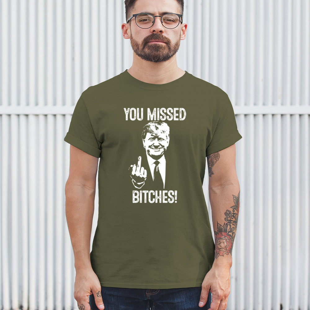 Commemorate Trump's resilience and determination with our bold "You Missed Bitches!" design. Show your support and patriotism.