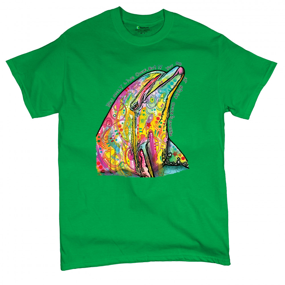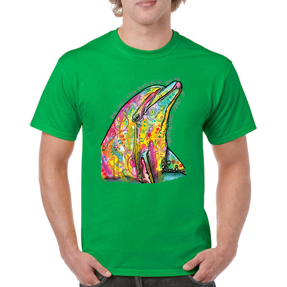YOU ONLY LIVE ONCE t-shirt cute neon dolphin dean russo yolo men's tee green