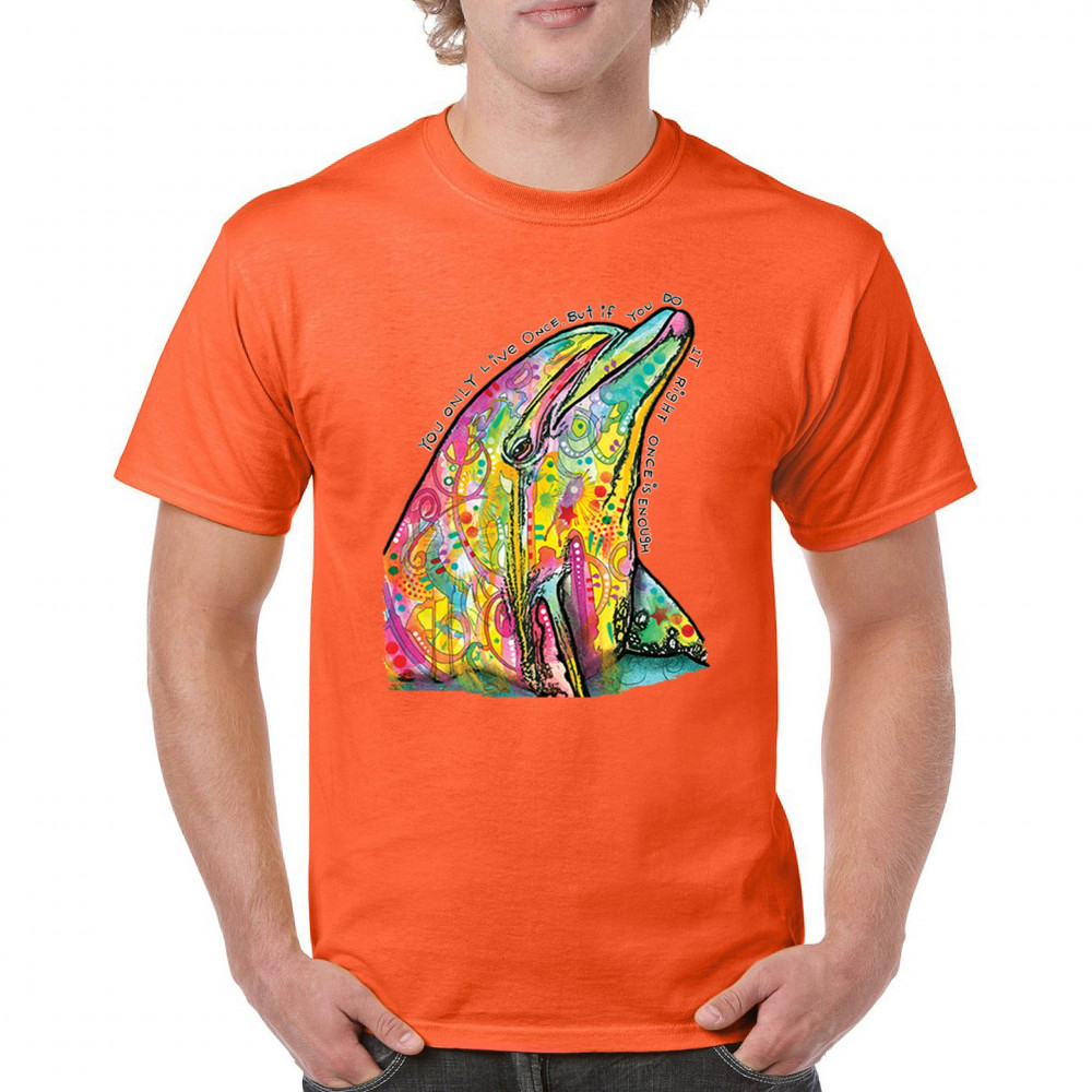 YOU ONLY LIVE ONCE t-shirt cute neon dolphin dean russo yolo men's tee orange