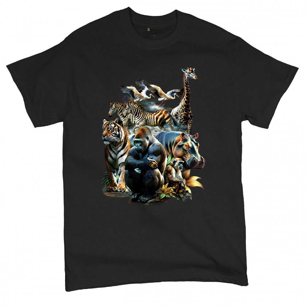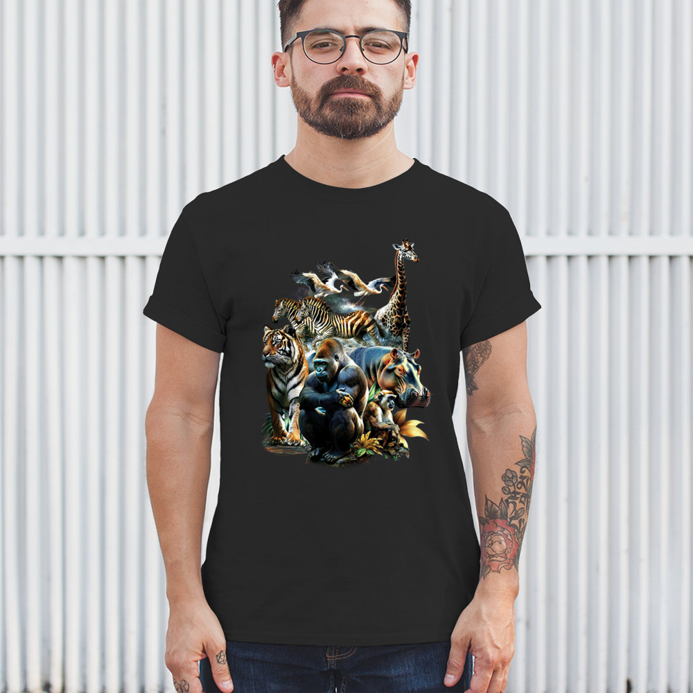 Packed with fierce energy and vibrant color, this wildlife design features a jungle coalition of gorilla, tiger, monkey, zebra, giraffe, hippo, and birds. A powerful tribute to animal beauty, biodiversity, and nature's harmony. Perfect for jungle tour enthusiasts, zoo visitors, or anyone passionate about wild conservation and stunning creature art.