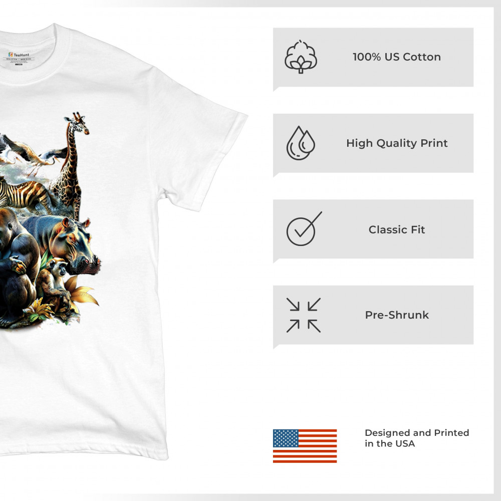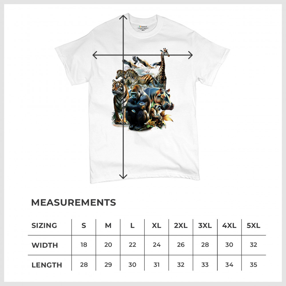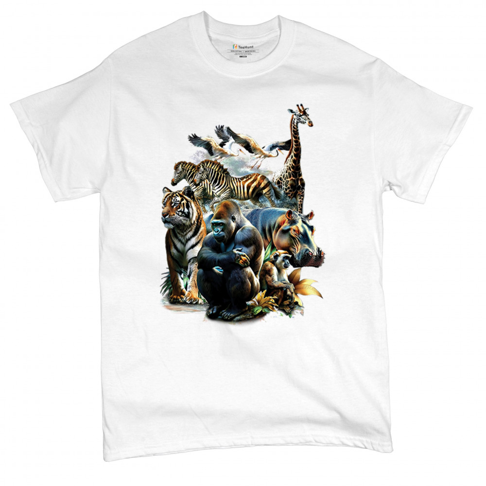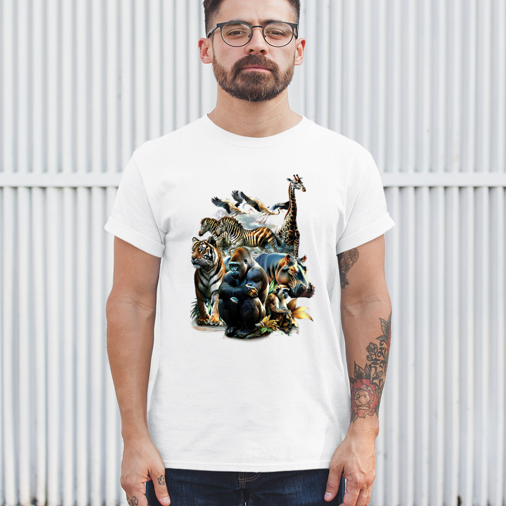 Packed with fierce energy and vibrant color, this wildlife design features a jungle coalition of gorilla, tiger, monkey, zebra, giraffe, hippo, and birds. A powerful tribute to animal beauty, biodiversity, and nature's harmony. Perfect for jungle tour enthusiasts, zoo visitors, or anyone passionate about wild conservation and stunning creature art.