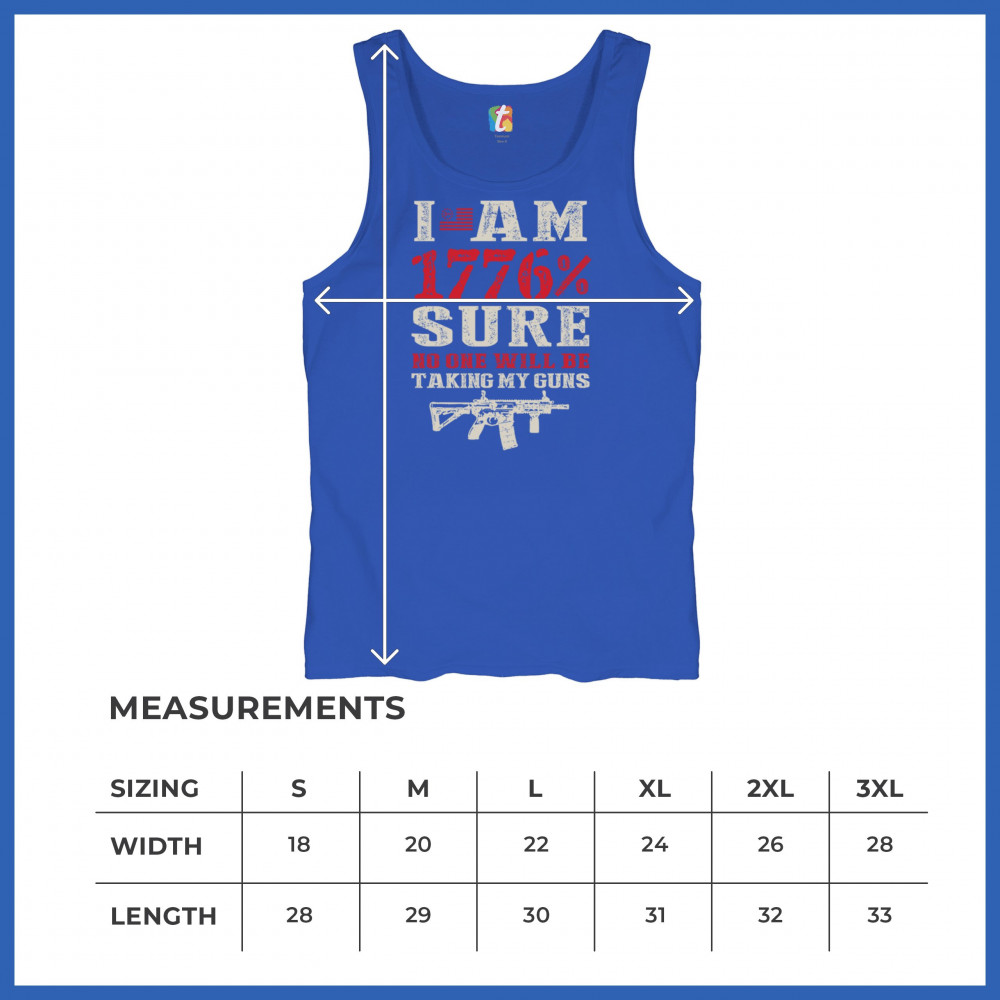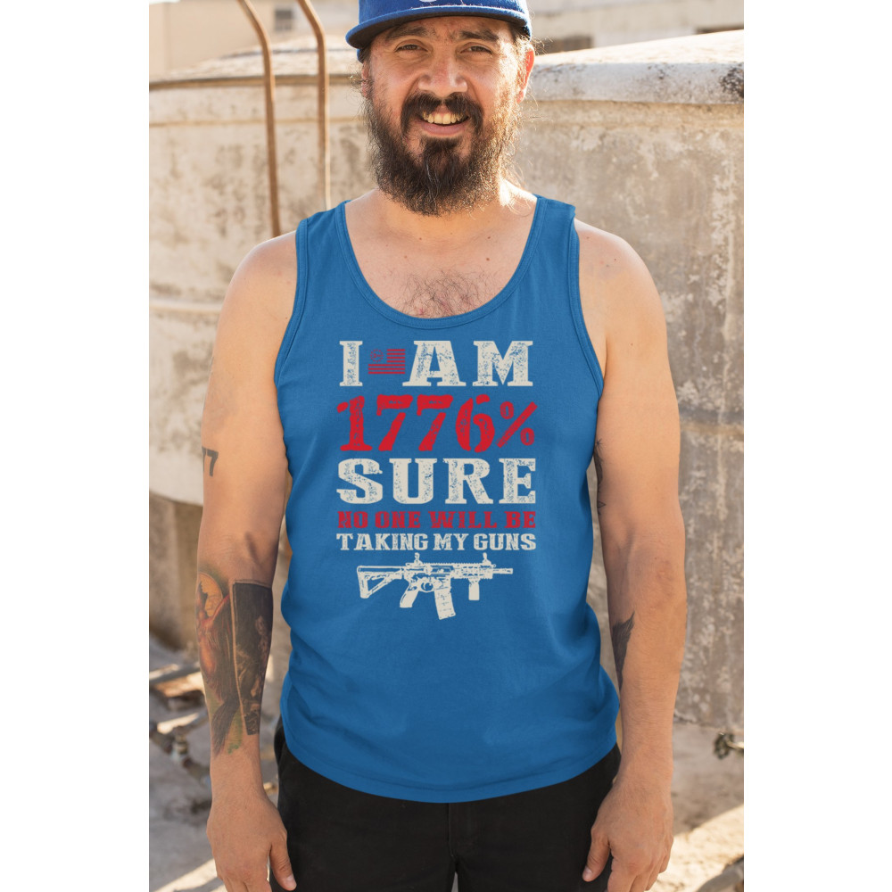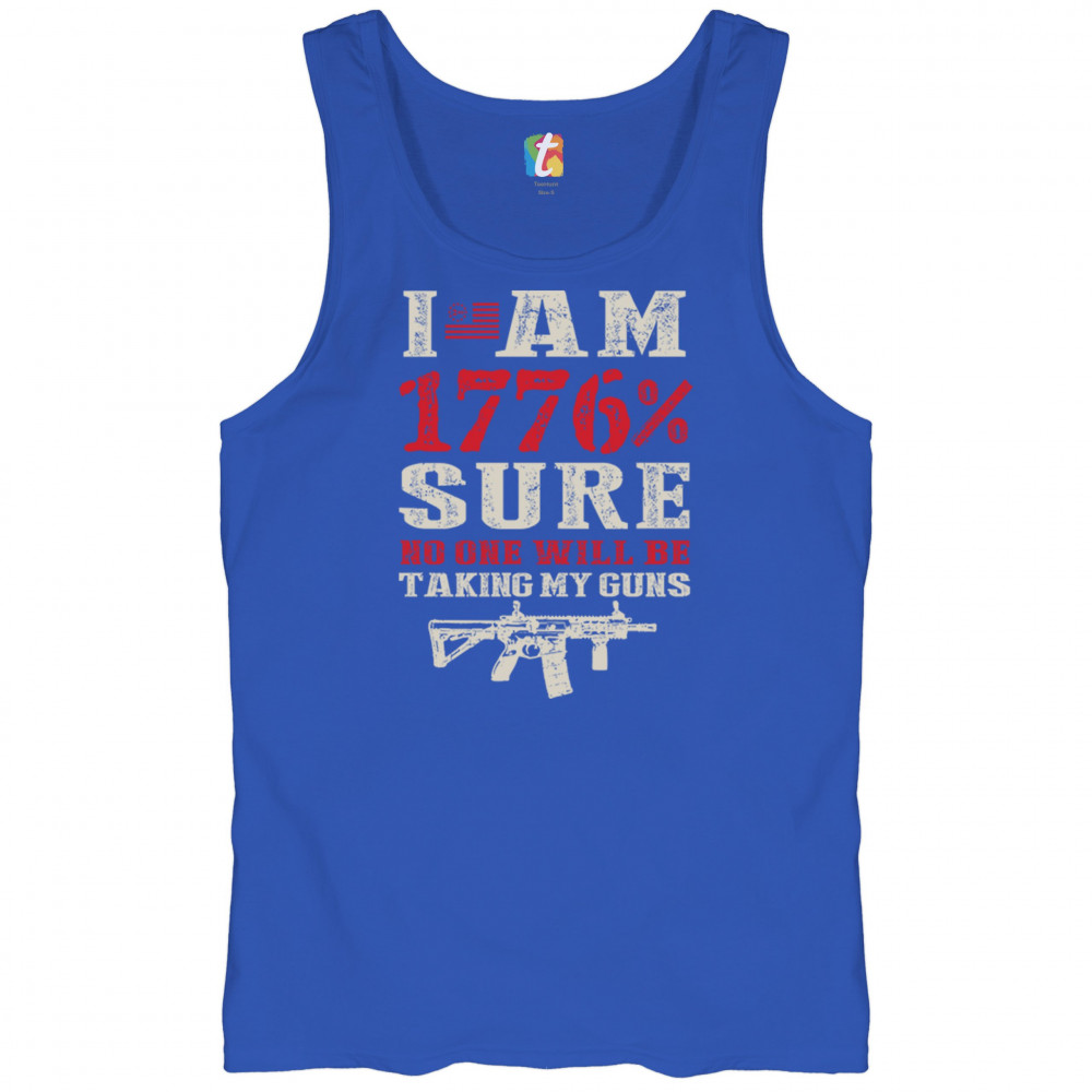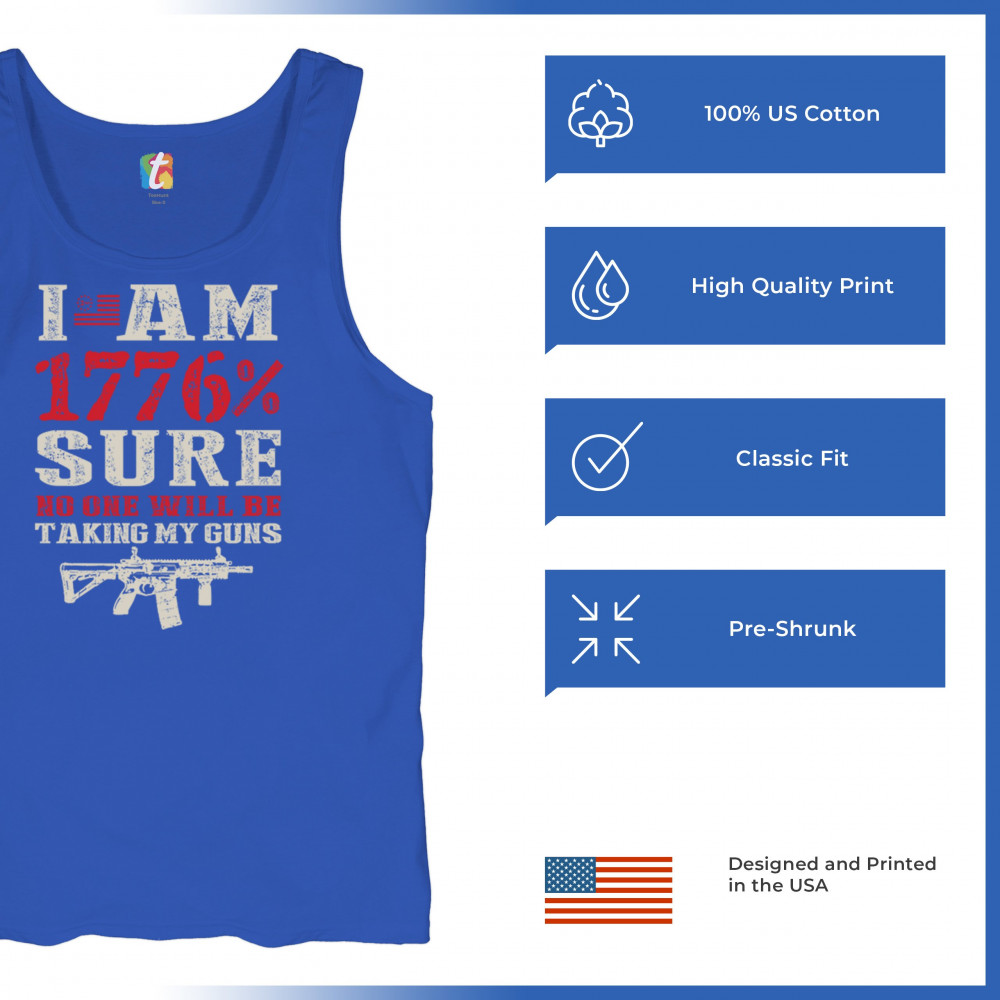 This eye-catching design shouts American pride with its 1776% certainty and pro-gun message. A distressed rifle graphic pairs with bold lettering and patriotic red, white, and blue styling. Perfect for gun owners, liberty advocates, and veterans who take their constitutional rights seriously. A true celebration of freedom and firepower.