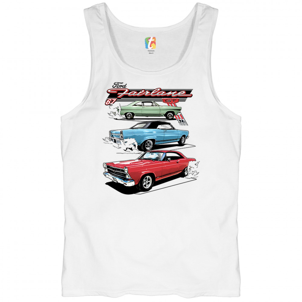 Features three 1967 Ford Fairlane GTs with retro burnout style. Great for muscle car fans, Ford collectors, car shows, and vintage meetups.