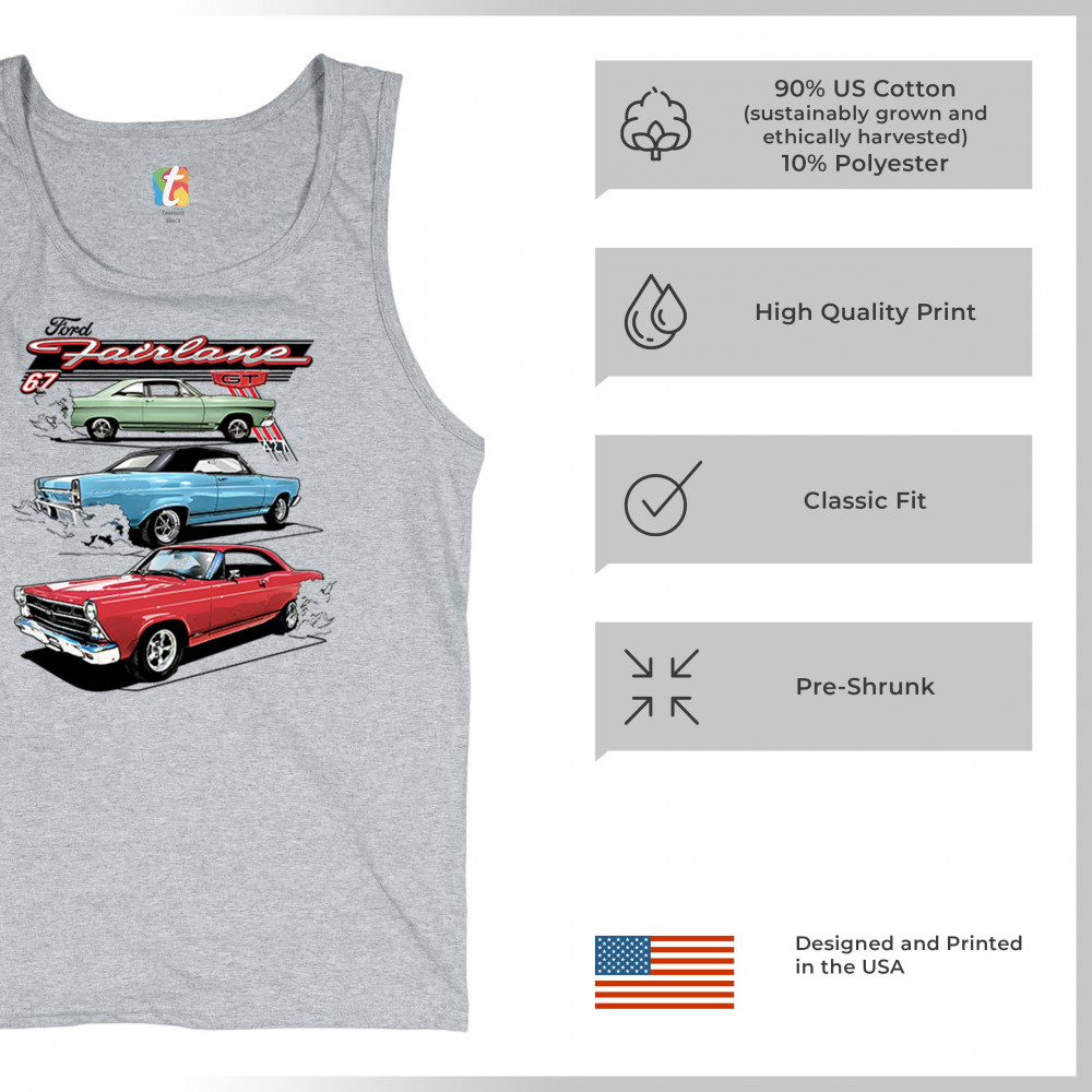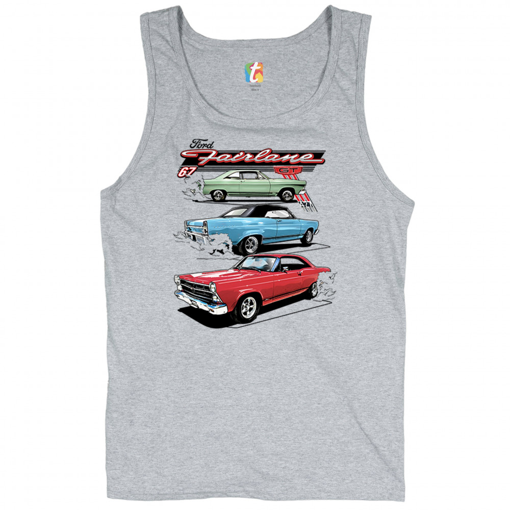 Features three 1967 Ford Fairlane GTs with retro burnout style. Great for muscle car fans, Ford collectors, car shows, and vintage meetups.