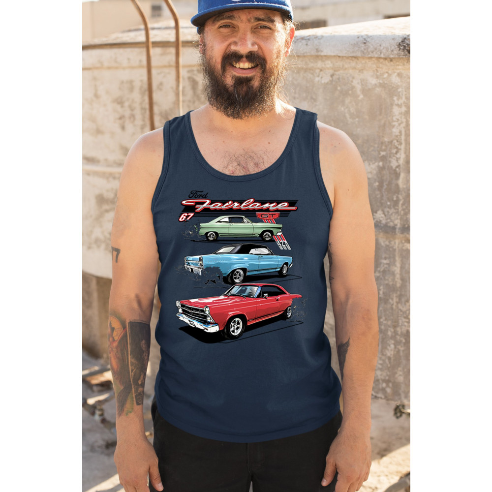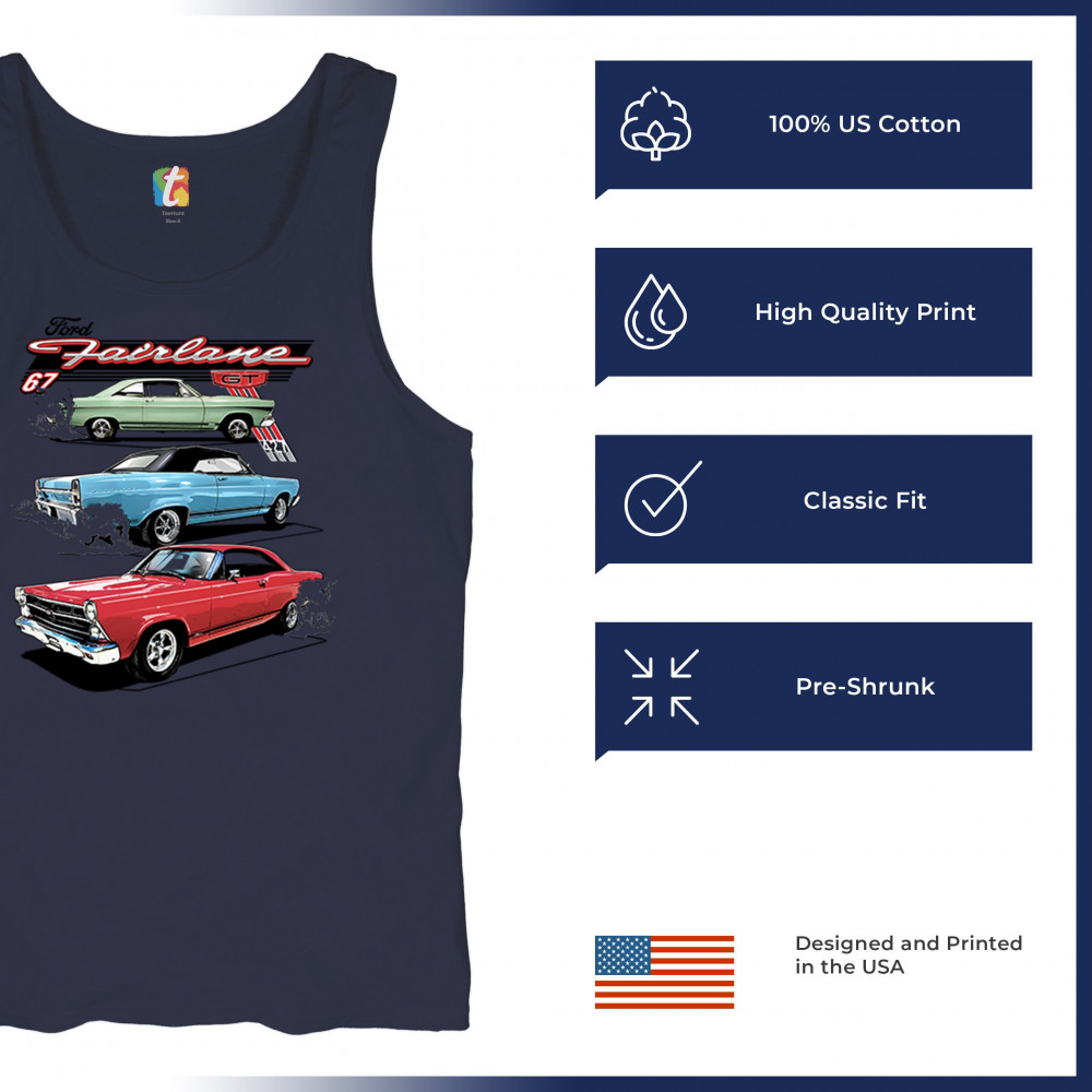 Features three 1967 Ford Fairlane GTs with retro burnout style. Great for muscle car fans, Ford collectors, car shows, and vintage meetups.