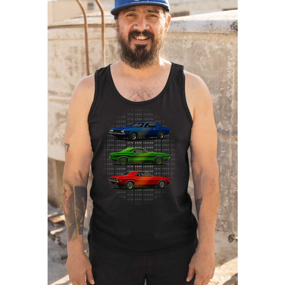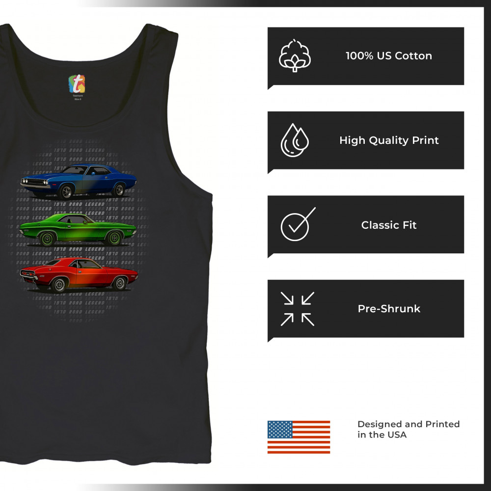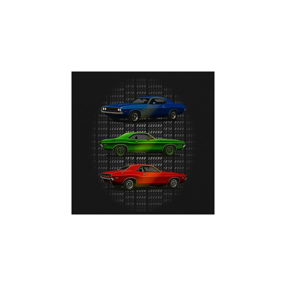 Three bold 1970 muscle cars, stacked in red, green, and blue, celebrate vintage power and road legend status. This retro-inspired design captures the essence of American car culture—made for gearheads, V8 fans, and anyone who lives for classic performance, heritage, and style.