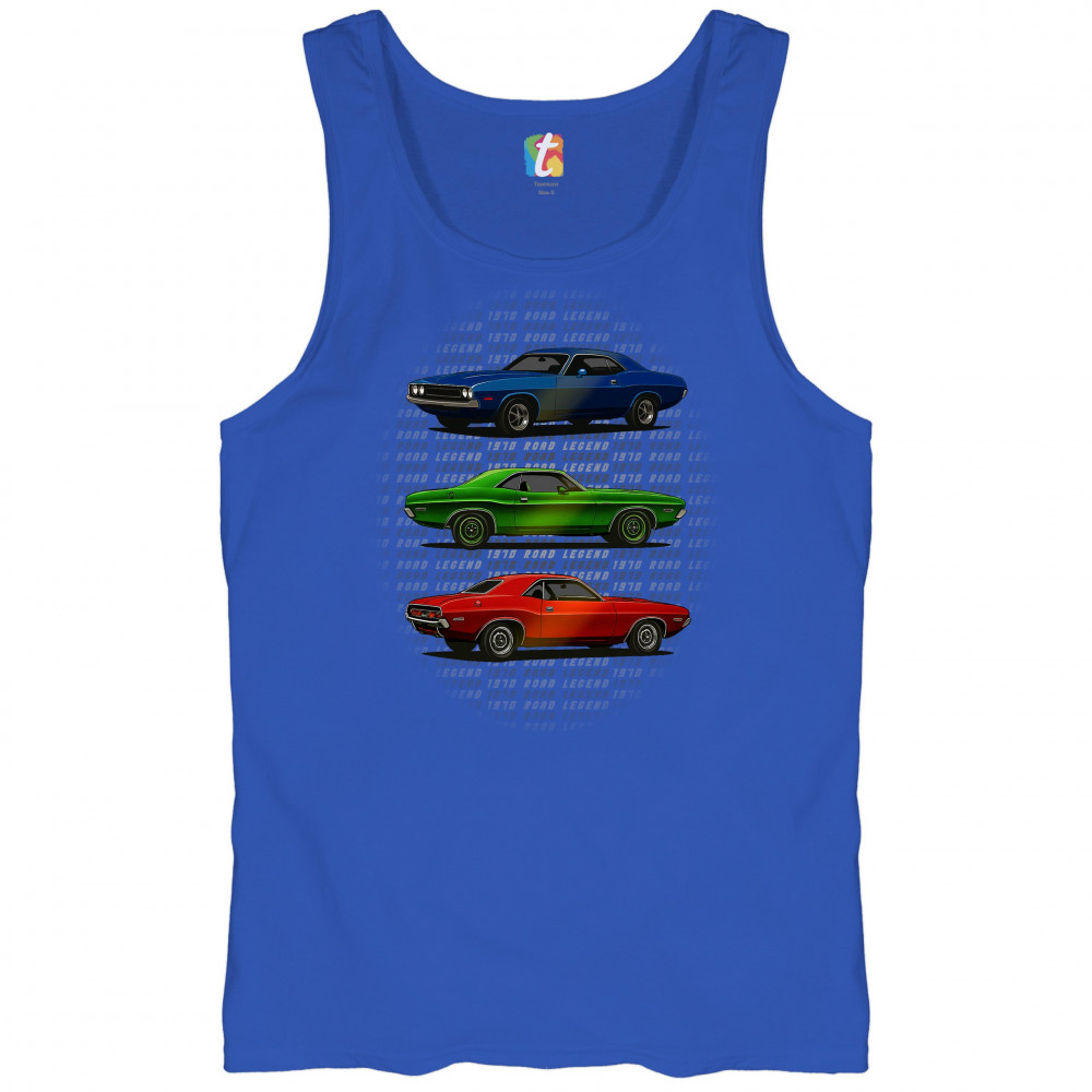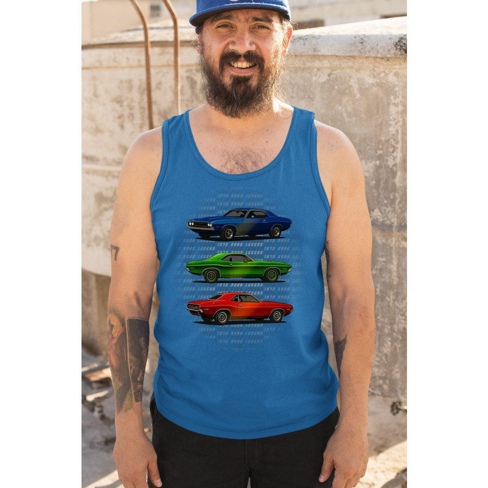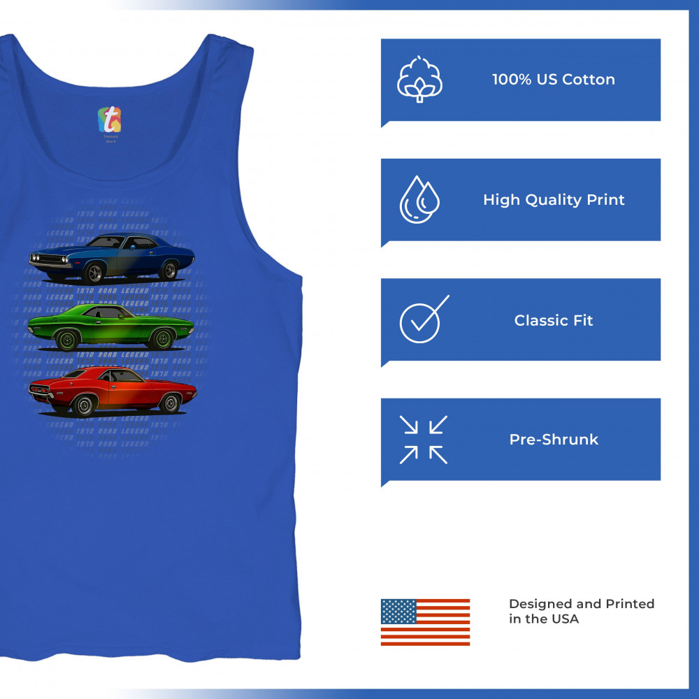 Three bold 1970 muscle cars, stacked in red, green, and blue, celebrate vintage power and road legend status. This retro-inspired design captures the essence of American car culture—made for gearheads, V8 fans, and anyone who lives for classic performance, heritage, and style.