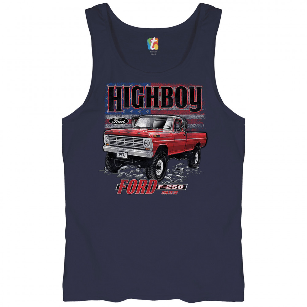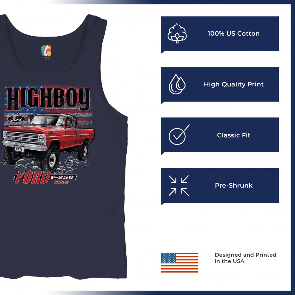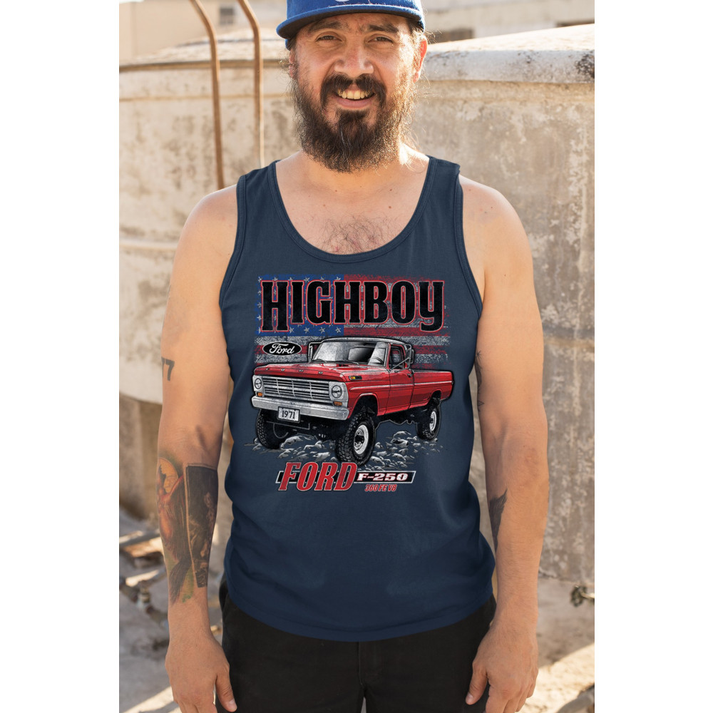 This vintage truck design features a 1971 Ford F-250 Highboy 4x4 with a classic lifted stance and patriotic flag background. Bold and nostalgic, it’s perfect for classic truck fans, 4x4 lovers, off-roaders, and collectors who appreciate American V8 tradition. Show it off at truck shows, meets, or cruise nights.