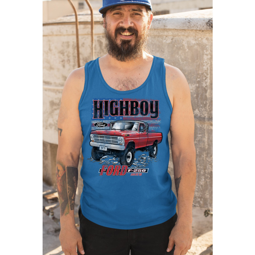 This vintage truck design features a 1971 Ford F-250 Highboy 4x4 with a classic lifted stance and patriotic flag background. Bold and nostalgic, it’s perfect for classic truck fans, 4x4 lovers, off-roaders, and collectors who appreciate American V8 tradition. Show it off at truck shows, meets, or cruise nights.