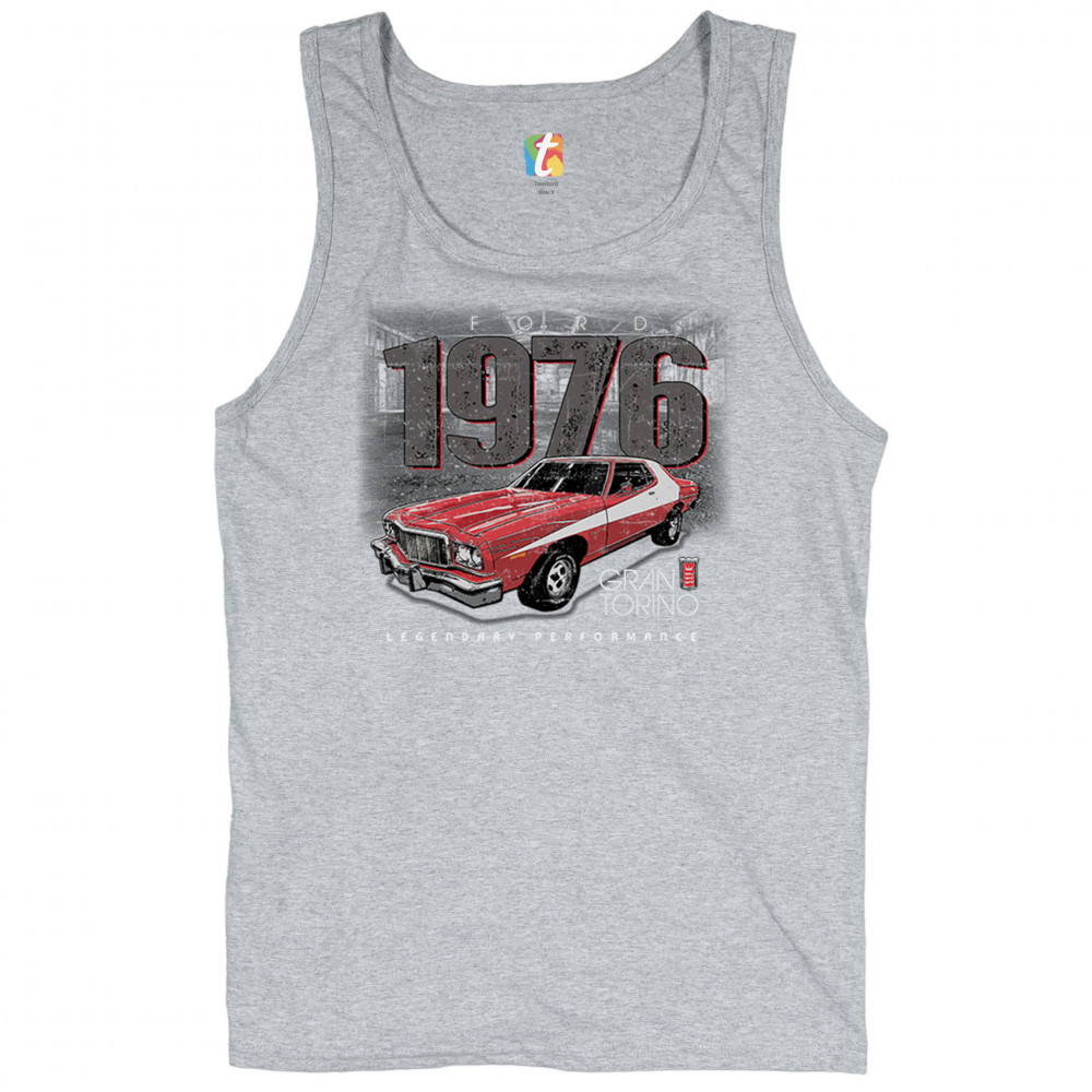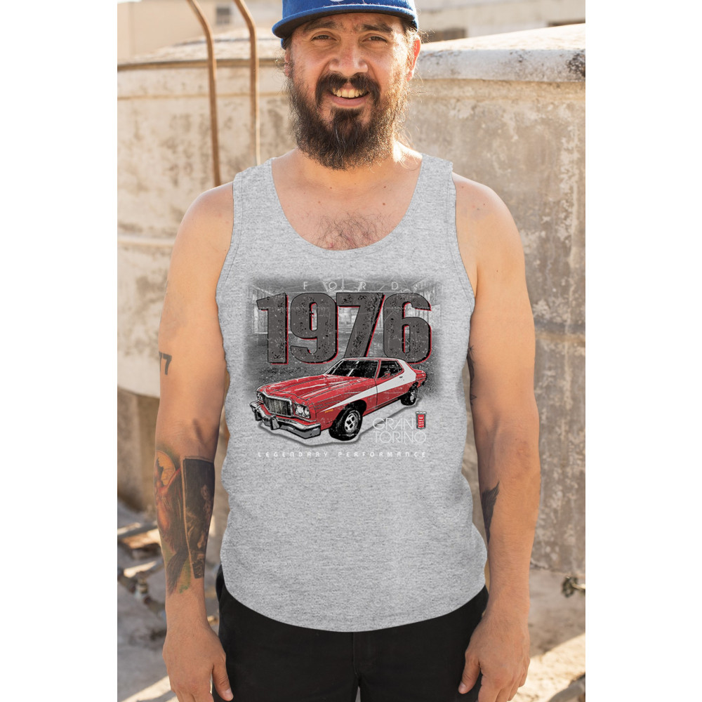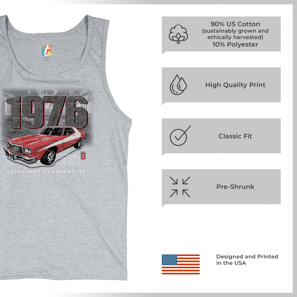 1976 Ford Gran Torino design with red and white retro style. Perfect for muscle car fans, Ford lovers, and classic car event gear.