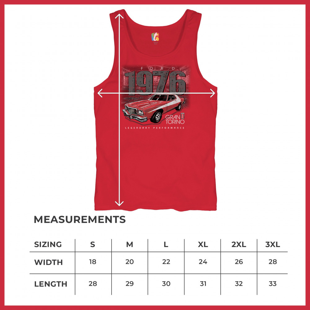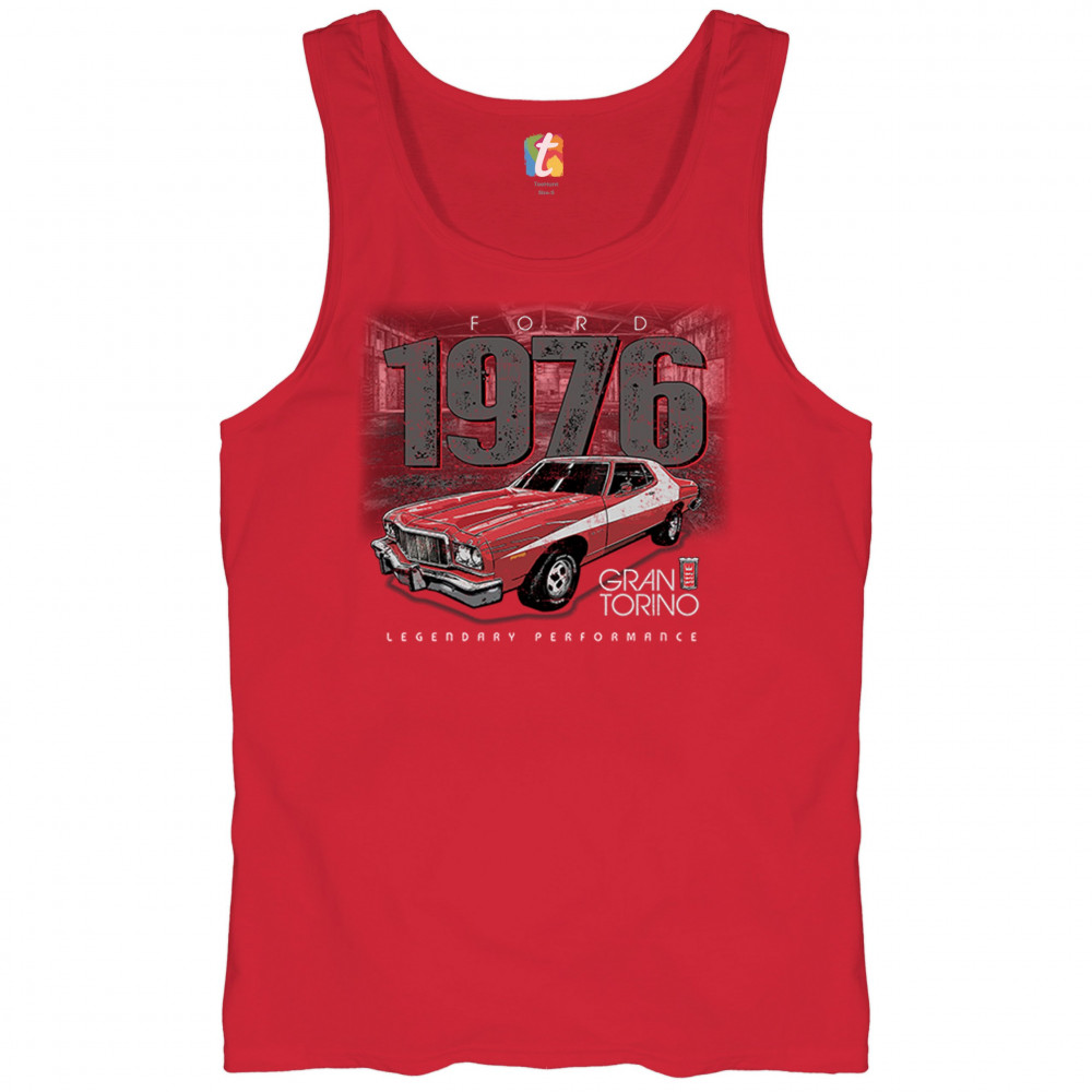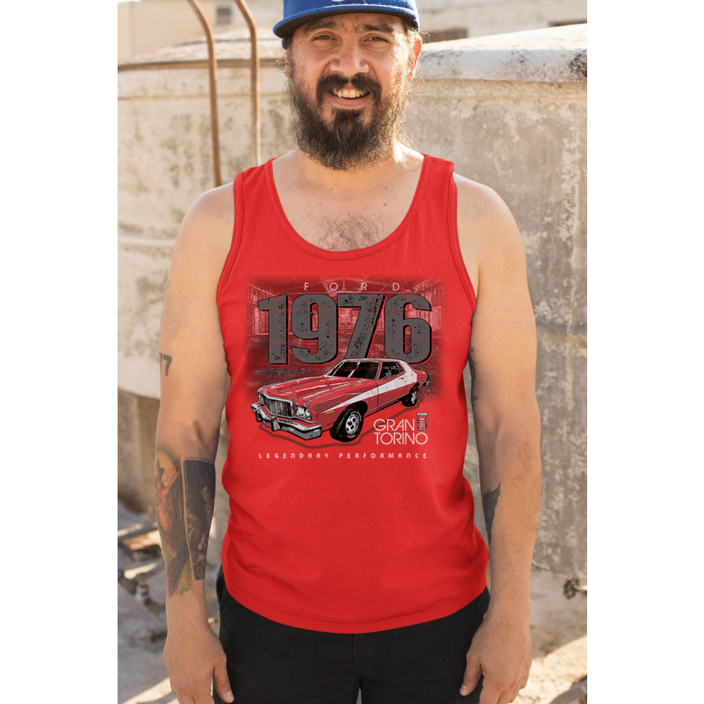 1976 Ford Gran Torino design with red and white retro style. Perfect for muscle car fans, Ford lovers, and classic car event gear.