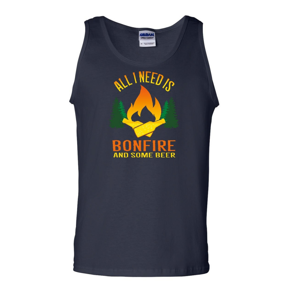ALL I NEED IS BONFIRE & SOME BEER tank top funny camping drinking sleeveless navy blue