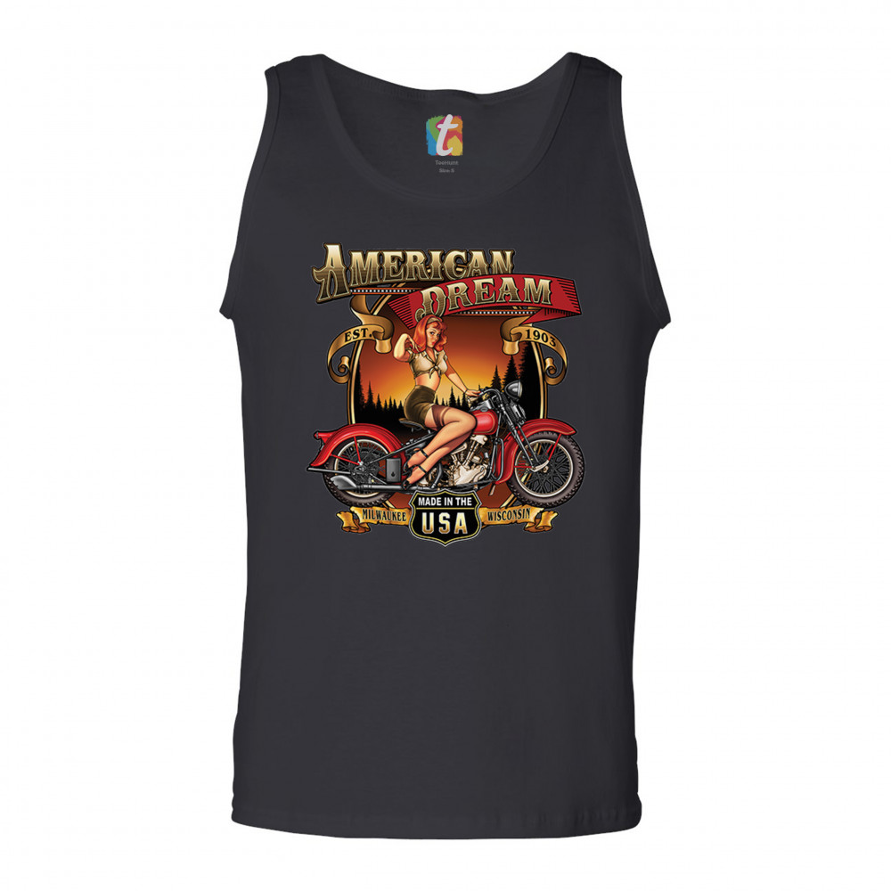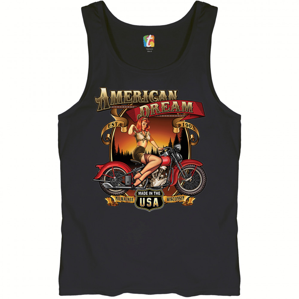 A print featuring a sexy pin up girl sitting on a vintage motorcycle. The print says: "American Dream est. 1903". In the bottom there is a sign saying: "made in the USA". To the left and right of it "Milwaukee Wisconsin" is written on a stripe. Great choice for any motorcycle enthusiast.