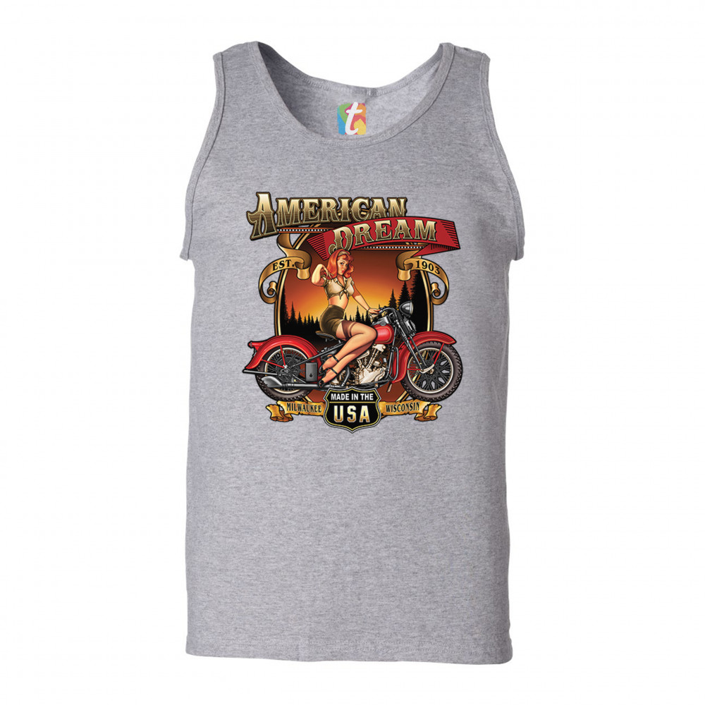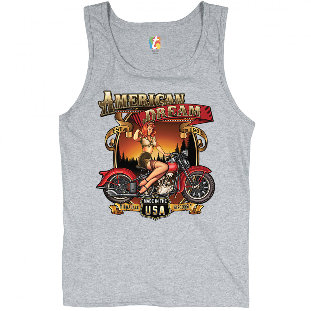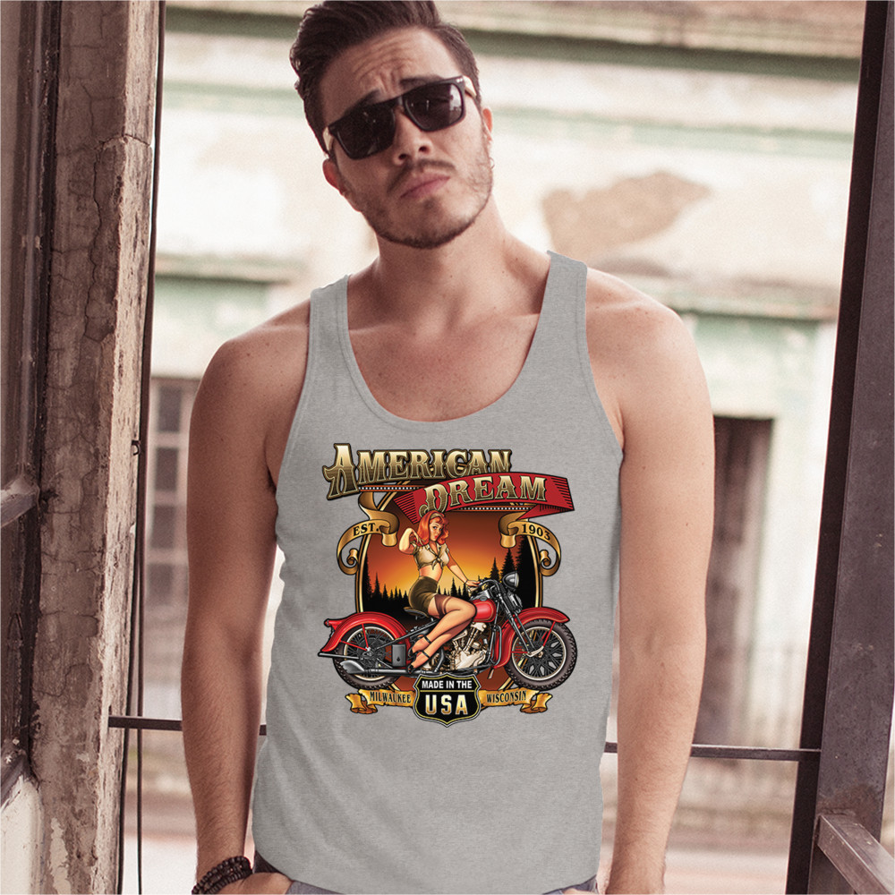 A print featuring a sexy pin up girl sitting on a vintage motorcycle. The print says: "American Dream est. 1903". In the bottom there is a sign saying: "made in the USA". To the left and right of it "Milwaukee Wisconsin" is written on a stripe. Great choice for any motorcycle enthusiast.
