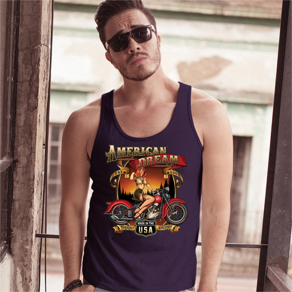 A print featuring a sexy pin up girl sitting on a vintage motorcycle. The print says: "American Dream est. 1903". In the bottom there is a sign saying: "made in the USA". To the left and right of it "Milwaukee Wisconsin" is written on a stripe. Great choice for any motorcycle enthusiast.