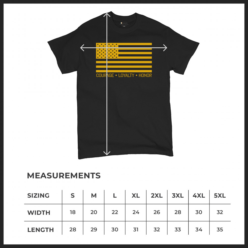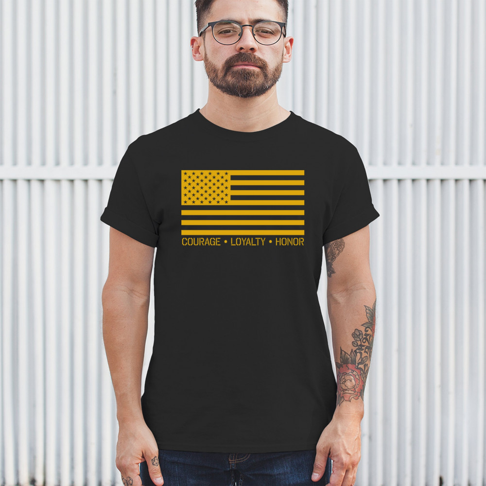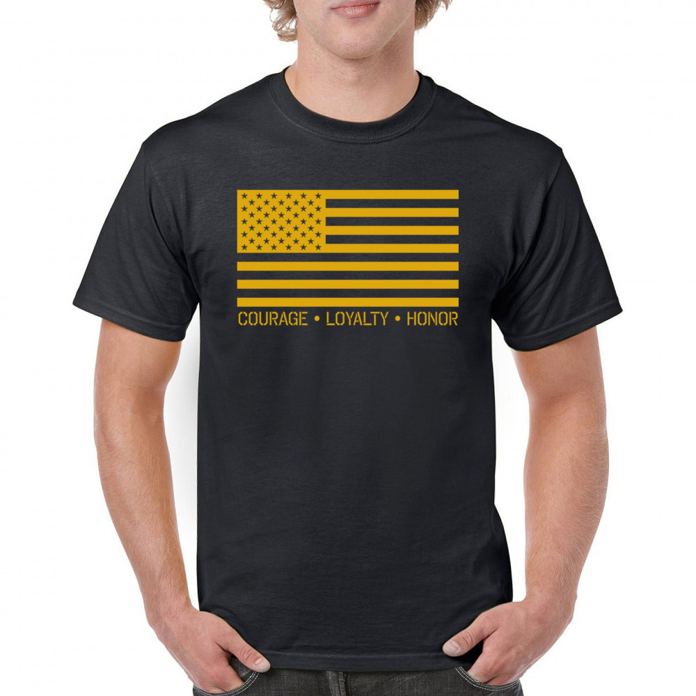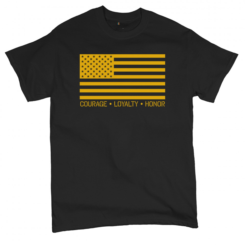 Honor the brave with our "Courage, Loyalty, Honor" USA flag shirt. Perfect for veterans and patriots. Ideal for Memorial Day and Veterans Day.