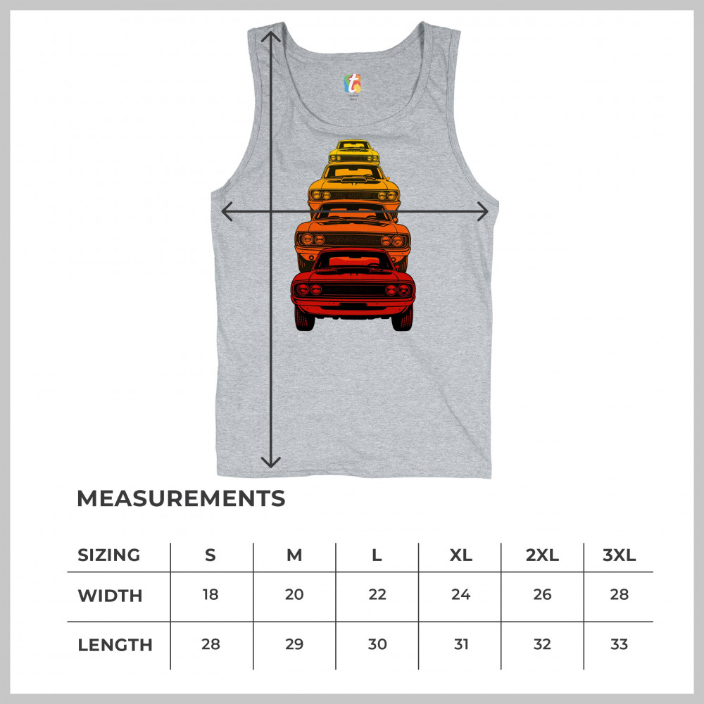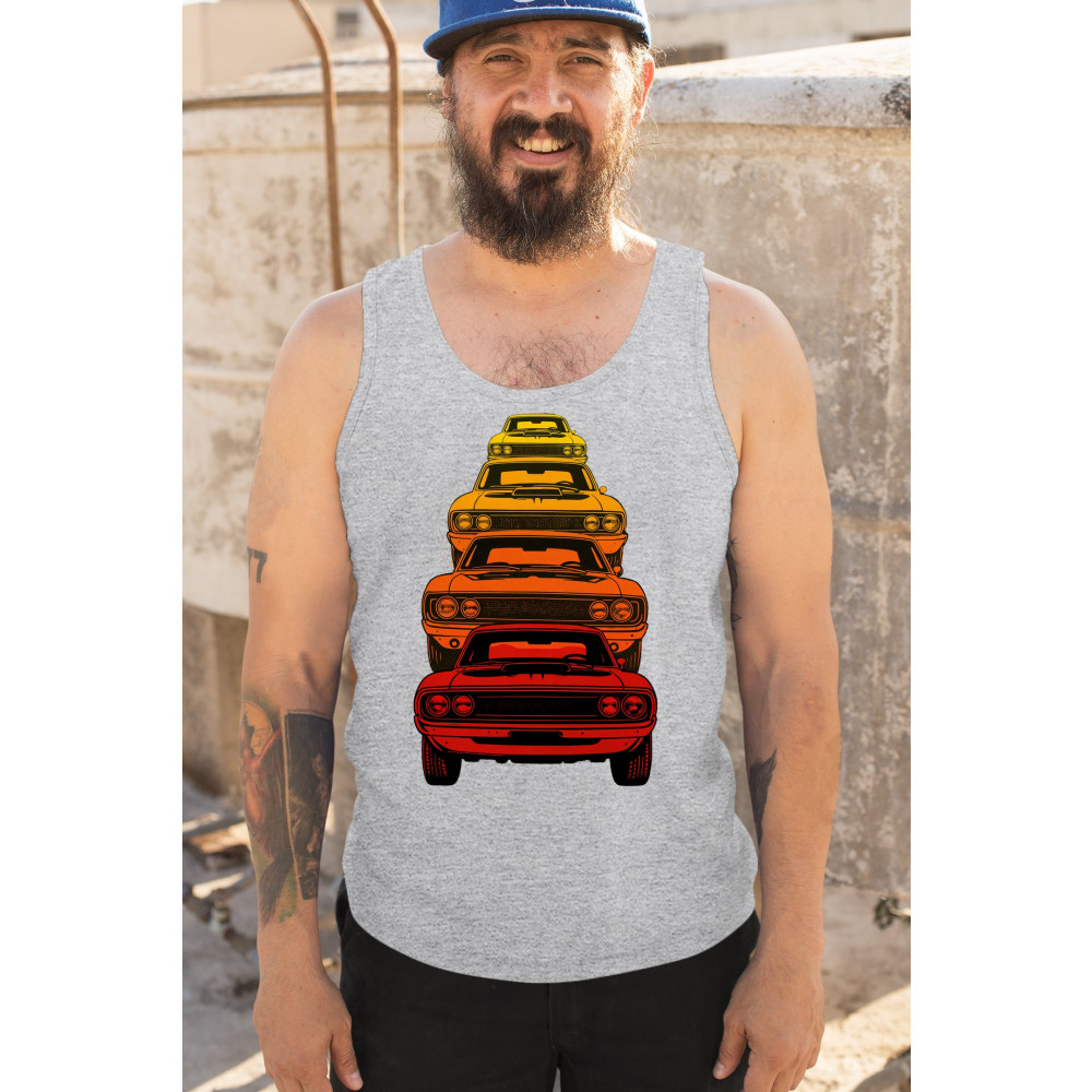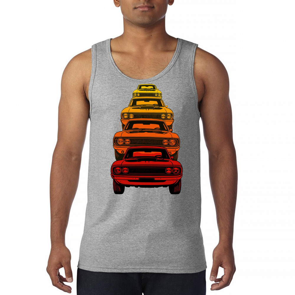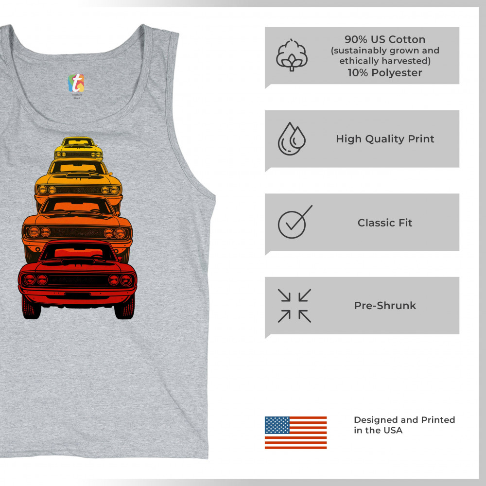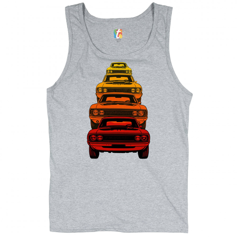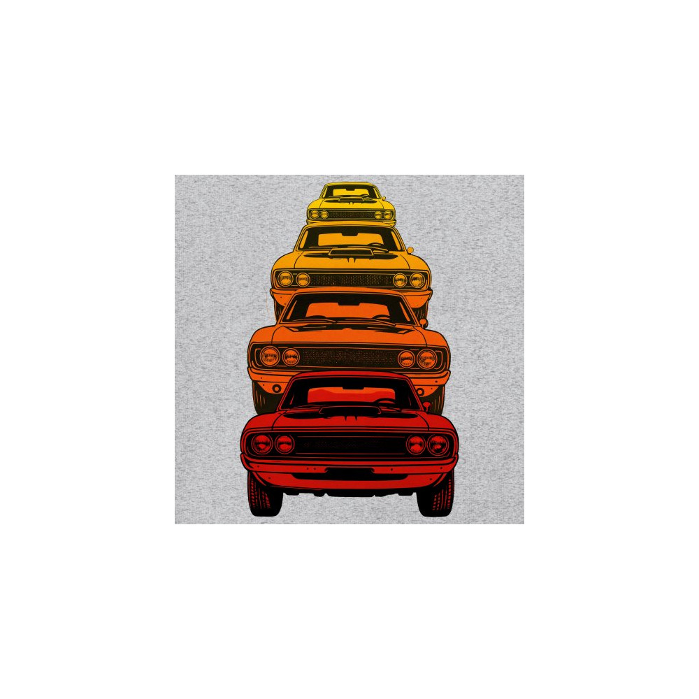 Celebrate horsepower heritage with this colorful lineup of classic muscle cars. Featuring a stacked gradient from red to yellow, this design brings bold retro attitude, V8 pride, and American torque to life. Perfect for collectors, gearheads, and fans of classic car power.
