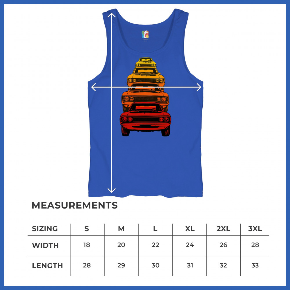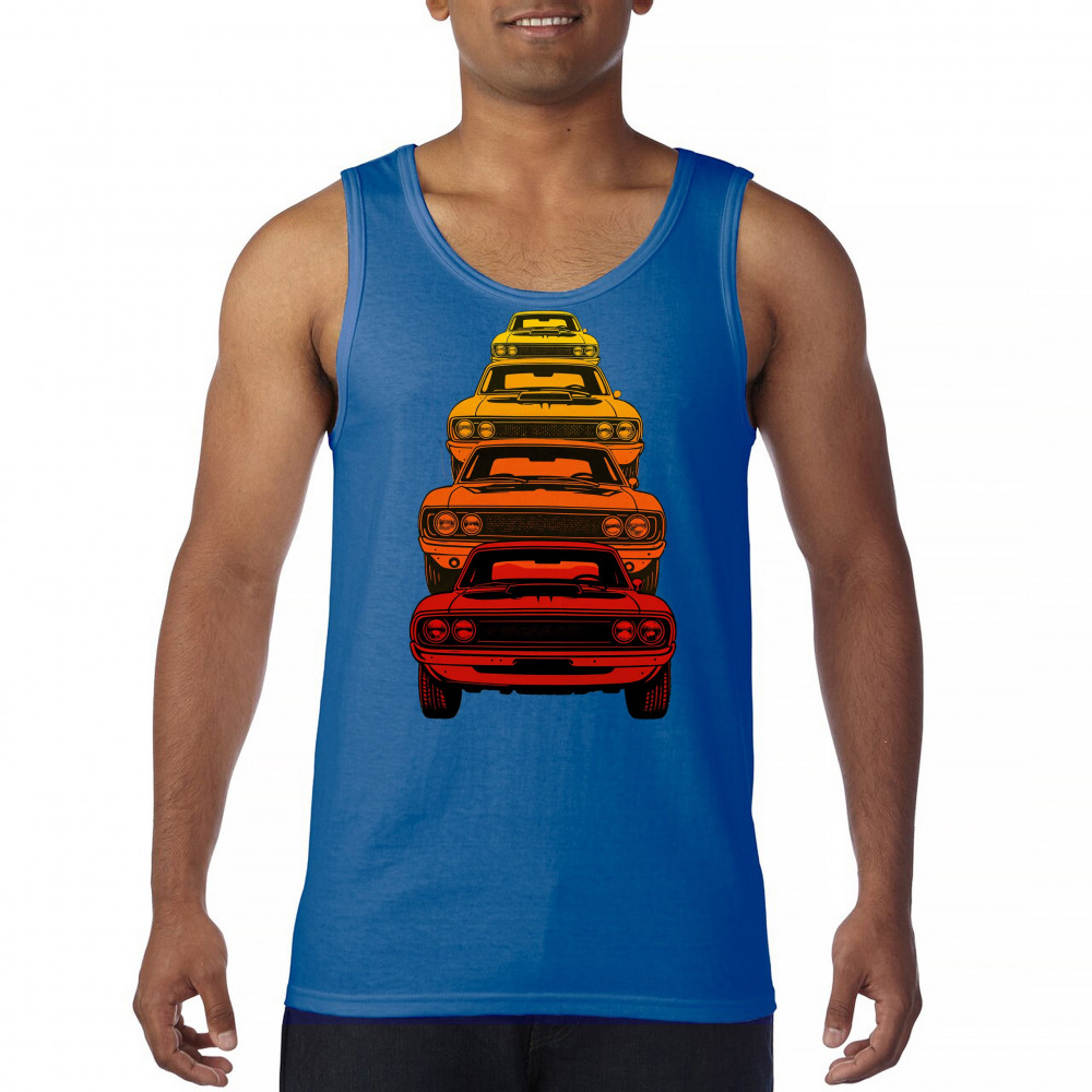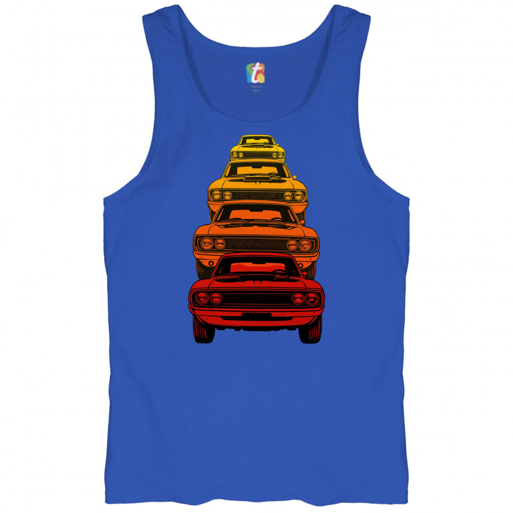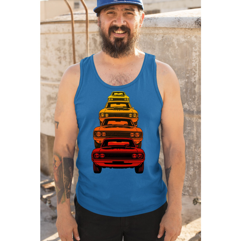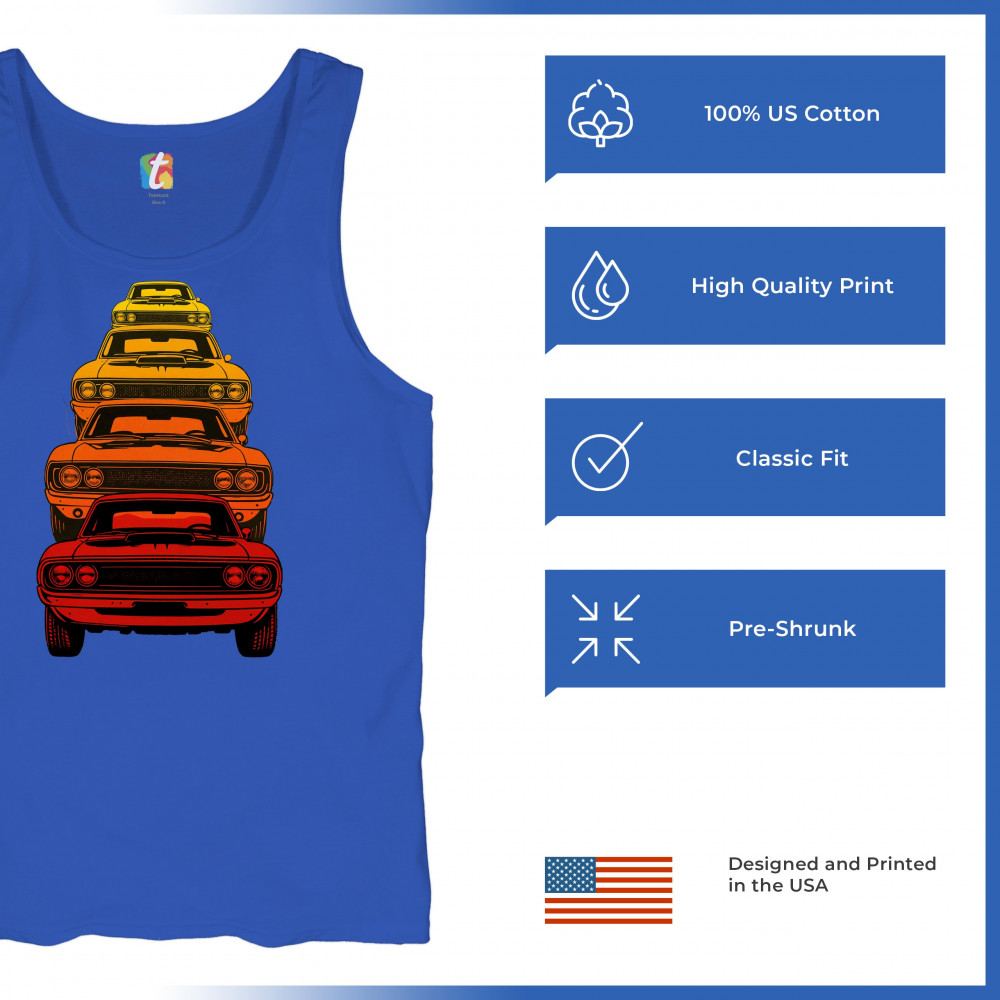 Celebrate horsepower heritage with this colorful lineup of classic muscle cars. Featuring a stacked gradient from red to yellow, this design brings bold retro attitude, V8 pride, and American torque to life. Perfect for collectors, gearheads, and fans of classic car power.